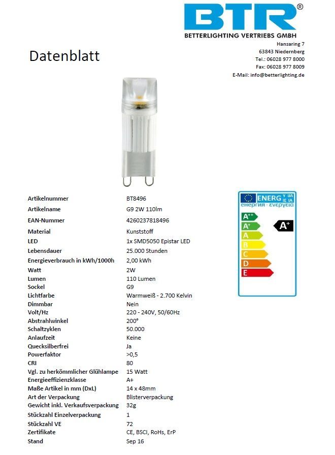 6er Set G9 LED bulb 2 Watt, 110Lumen Energiesparlampe Leuchtmittel