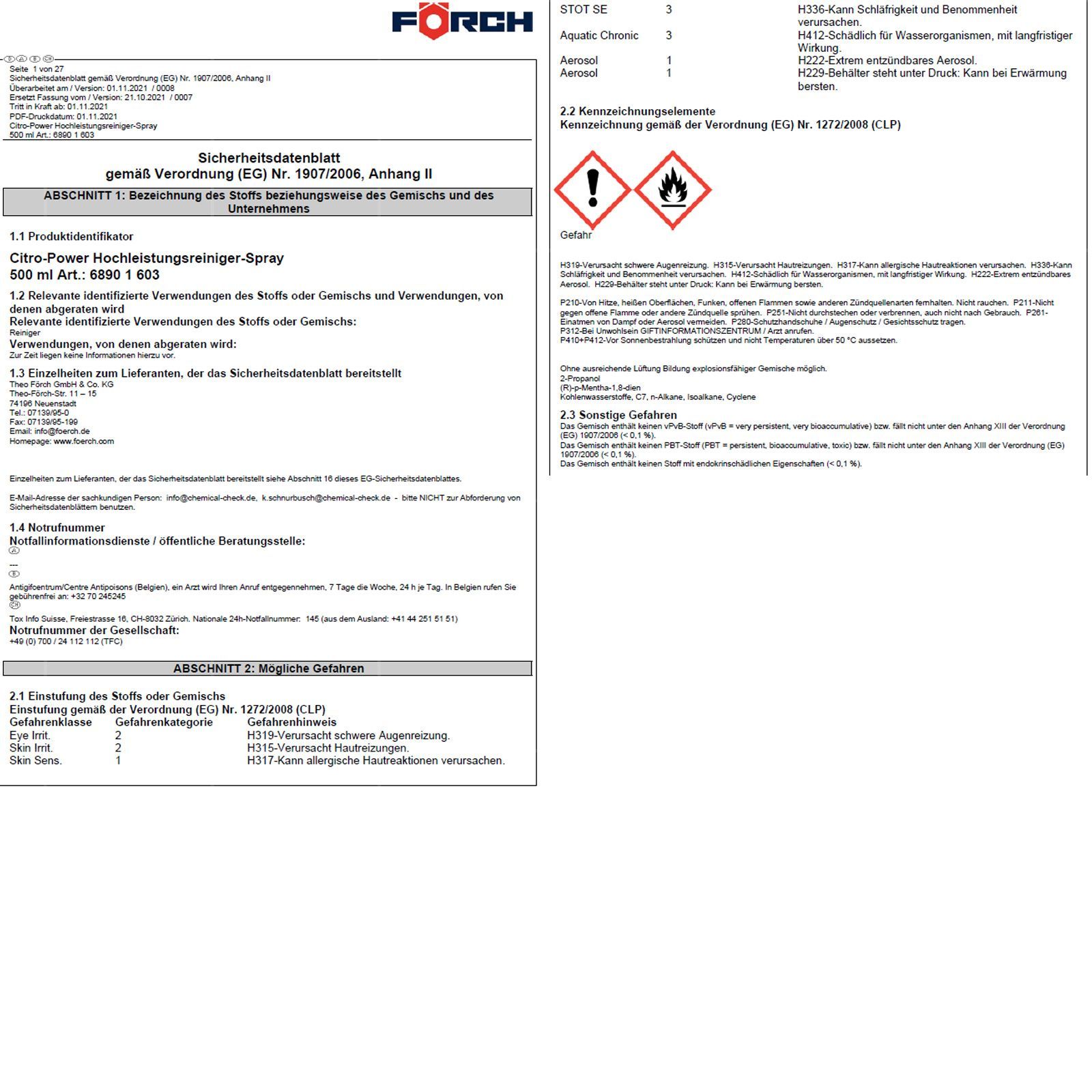 6x FÖRCH R603 Citro-Power Hochleistungsreiniger-Spray 0.5 L Fett Wachs Klebstoff