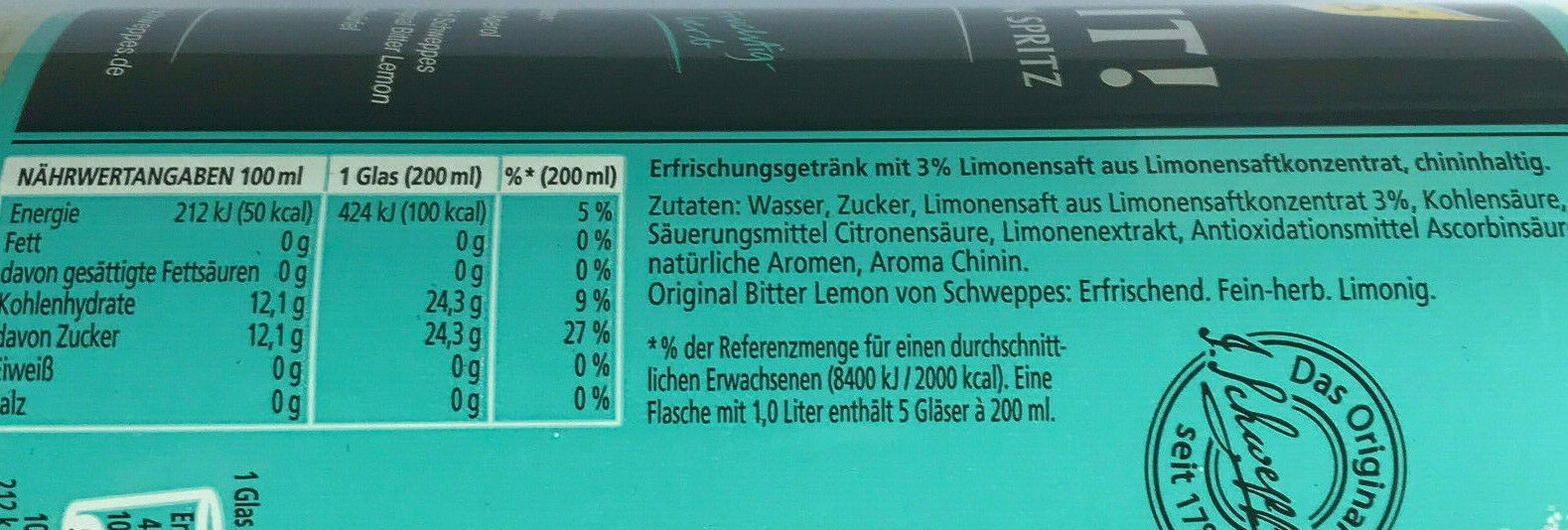6x1000ml Schweppes Original Bitter Lemon PET - Mehrweg -