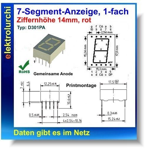 7-Segment-Anzeige, 1-fach, rot 14mm, gemein. Anode TFK Typ: D301PA 2St