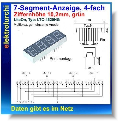 7-Segment-Anzeige, 4-fach, grün 10,2mm, gem. Anode LiteOn LTC-4620HG 1St