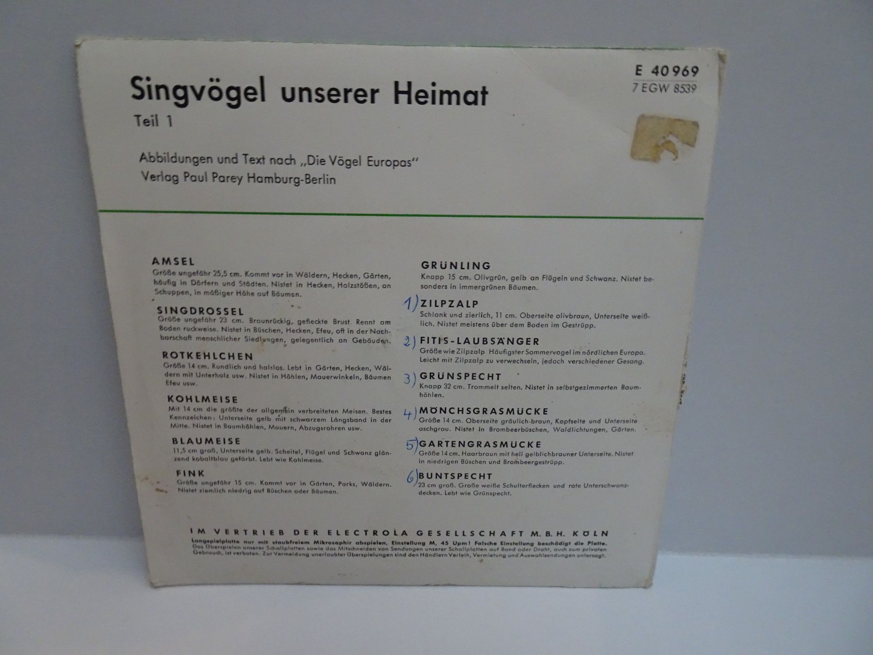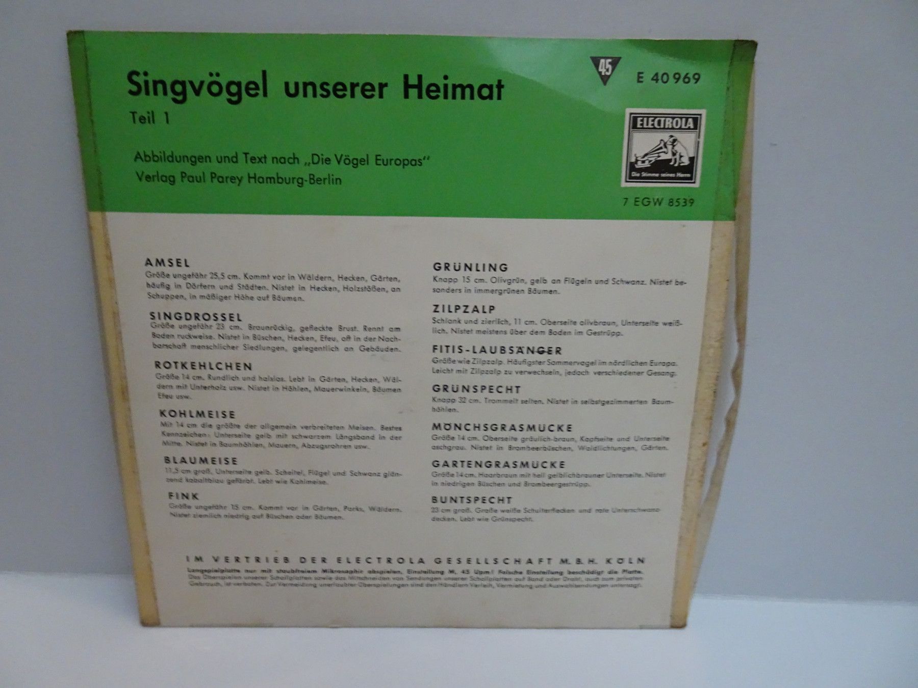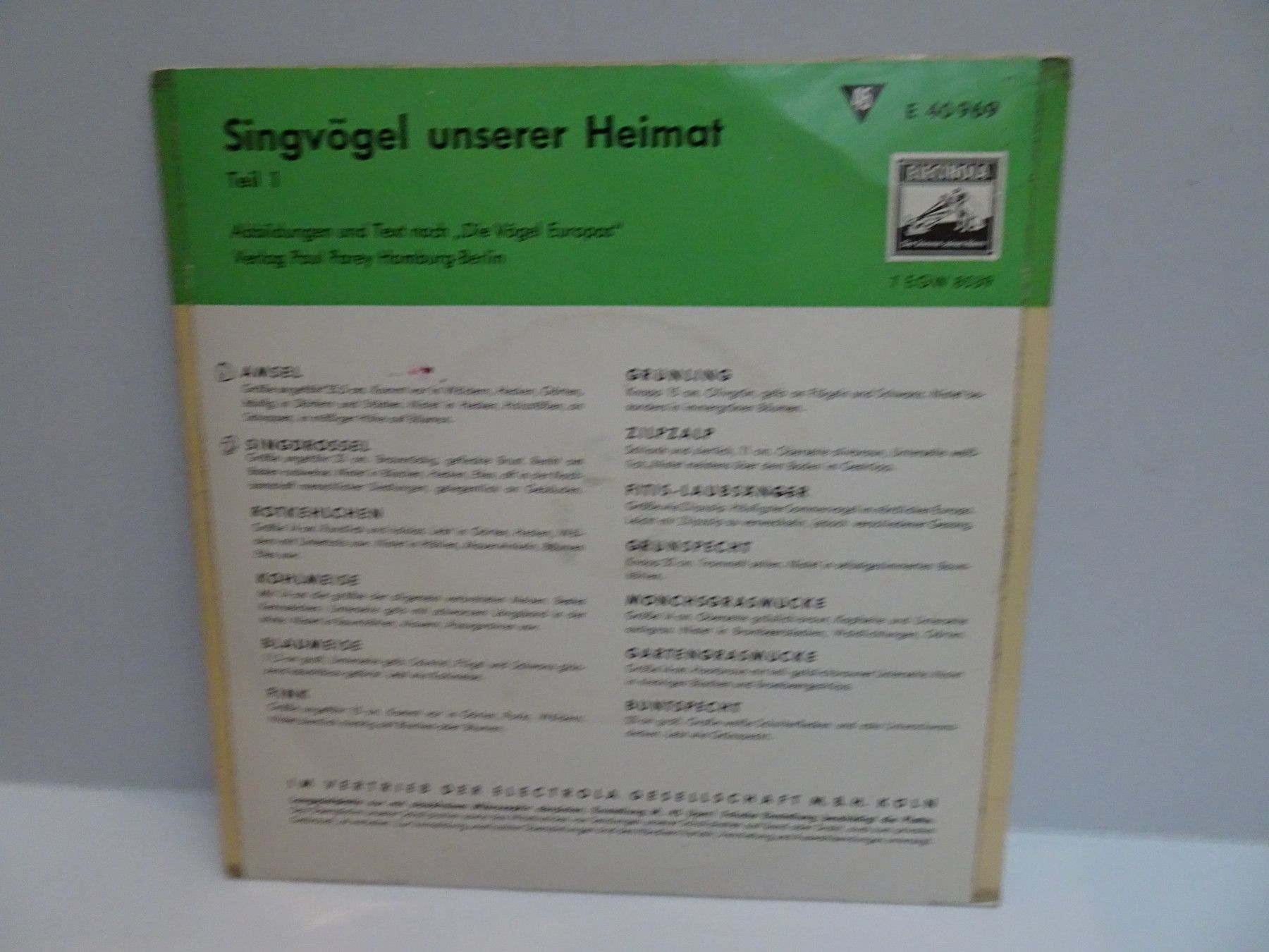 7" Single Electrola E40969 Singvögel unserer Heimat Die Vögel Europas Paul Parey