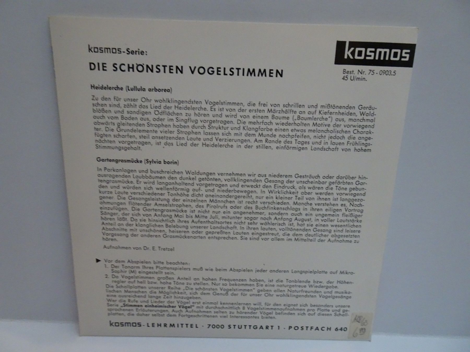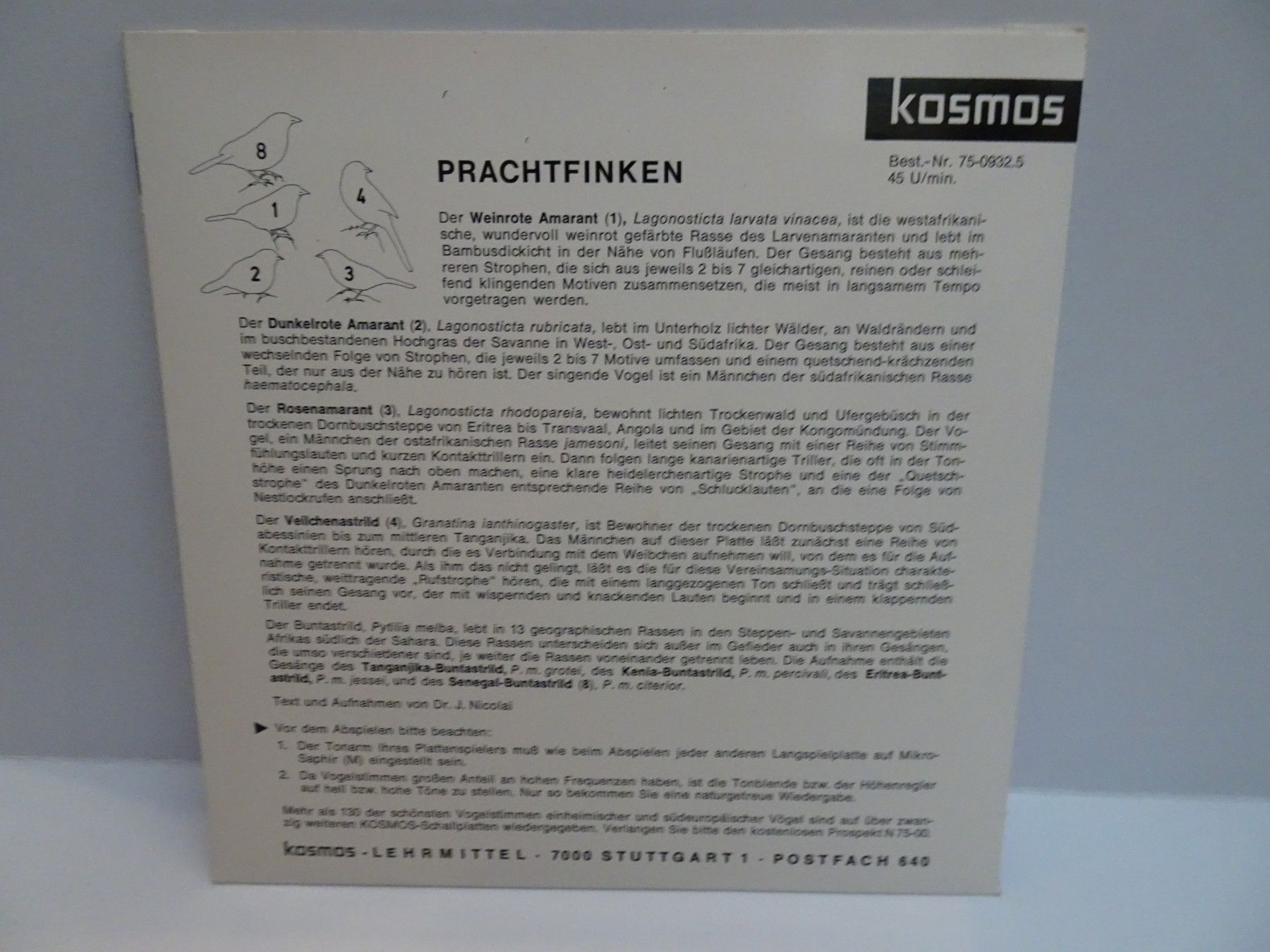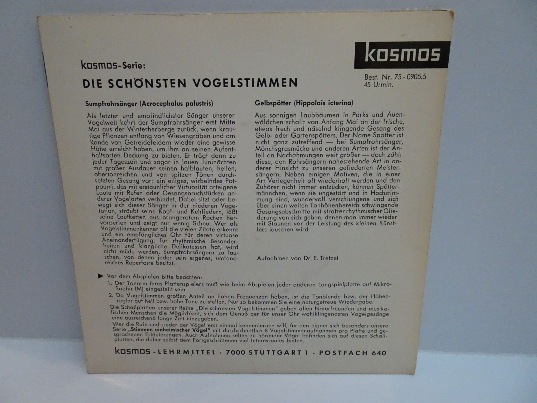 7" Single Kosmos Lehrmittel 75-0 Die schönsten Vogelstimmen