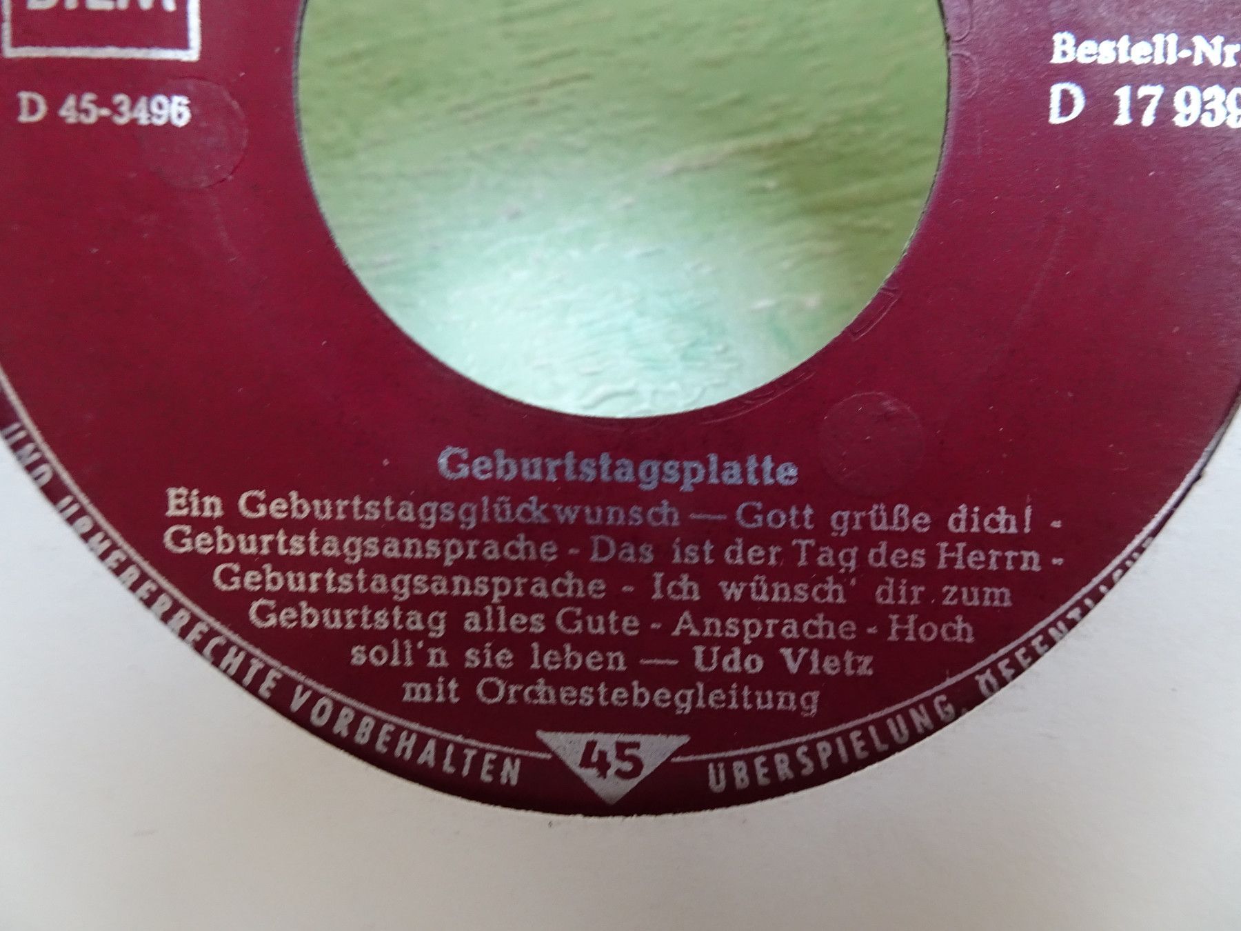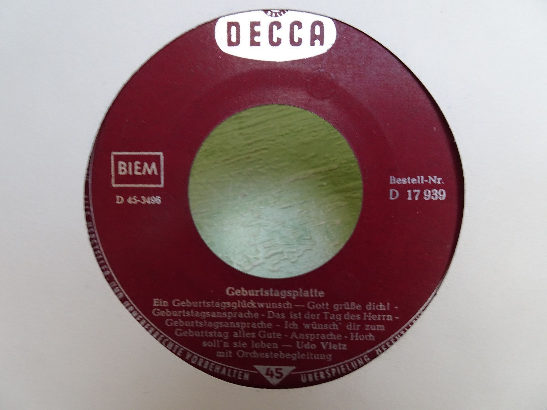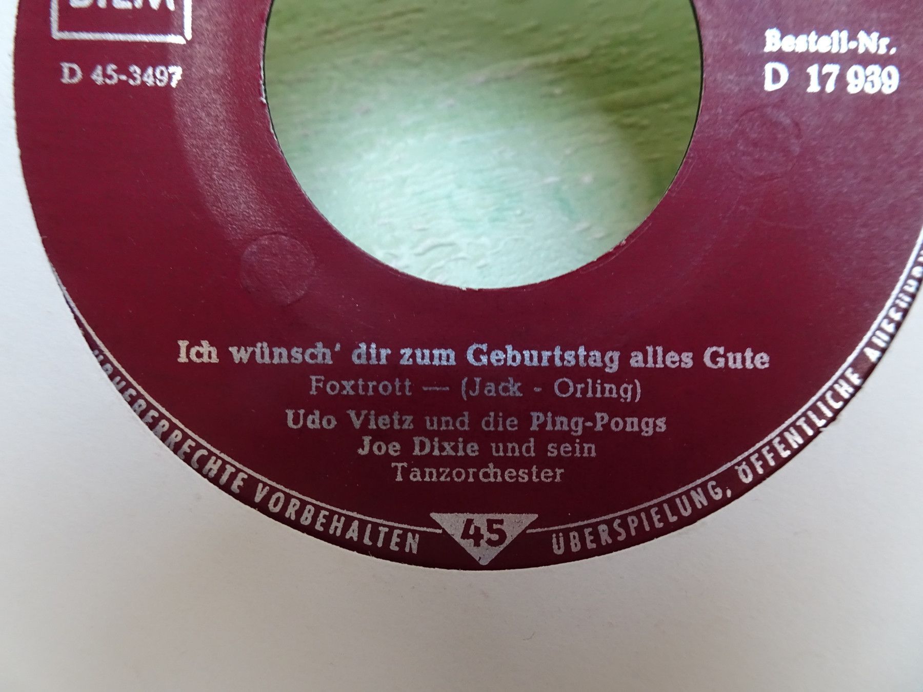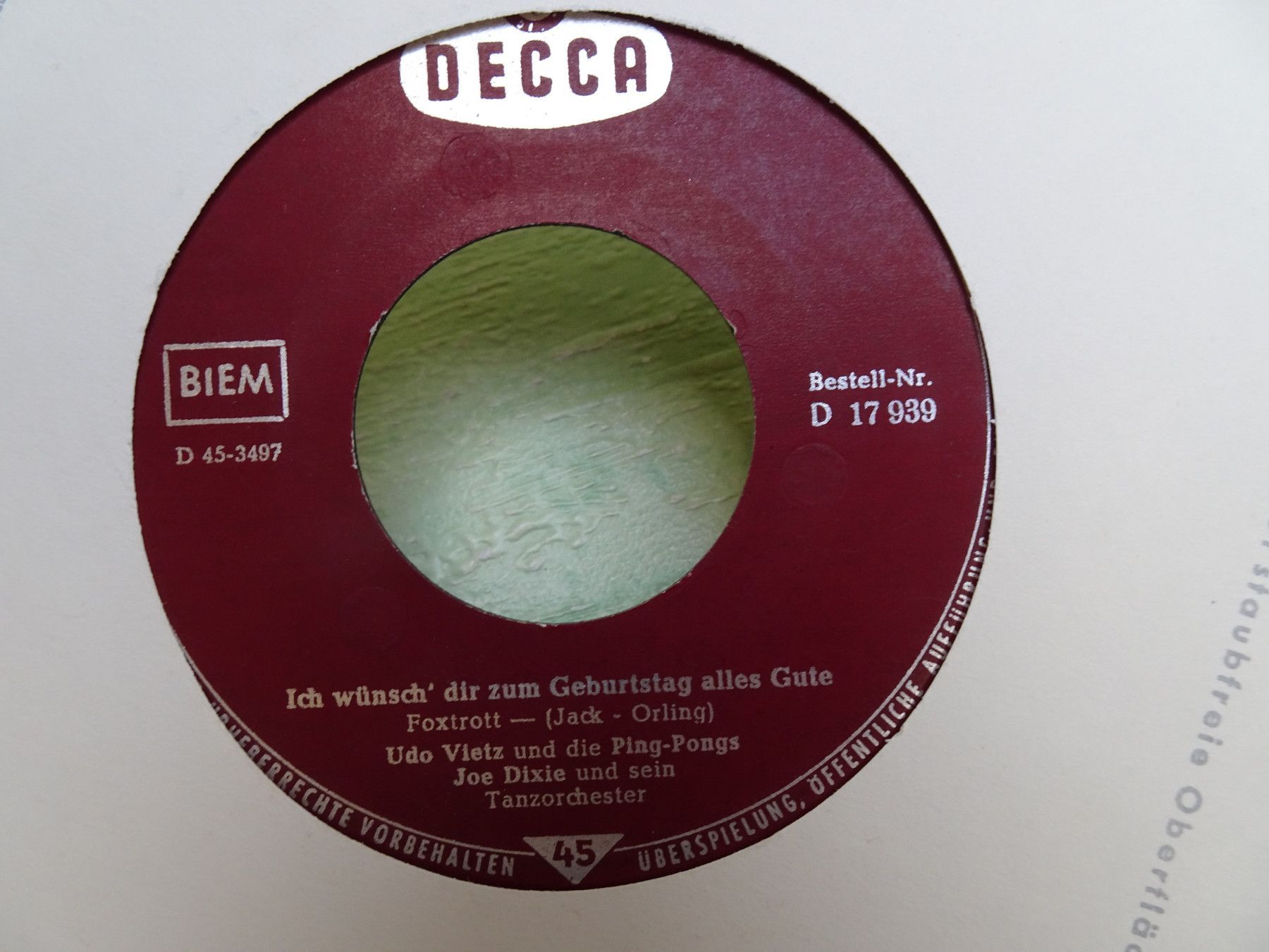 * * * Sammeln & Seltenes - Hörspiel Vinyl * * * * ... aus Freude an schönen Dingen ..... Tonbuch - Bilderbuch - Vinyl - Schallfolie - Single - 7 9.1 : Decca D17939 Geburtstagsplatte Ich wünsch Dir zum Geburtstag alles Gute Udo Vietz , Die Ping-Pongs Joe Dixie und sein Orchester Single : gut+ 9.2