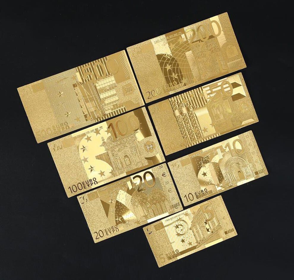 Satz mit 4 bis 8 Scheine - Euro Banknoten - vergoldet Folie - sehr selten 5 bis 500 Euro Gold Plated mit Farbe Technische Information zum Artikel Material: vergoldet Größe: original Größe Erhaltung: Neu Verpackung: Folie Das ideale Geschenk oder natürlich auch zum selber sammeln Natürlich handelt es