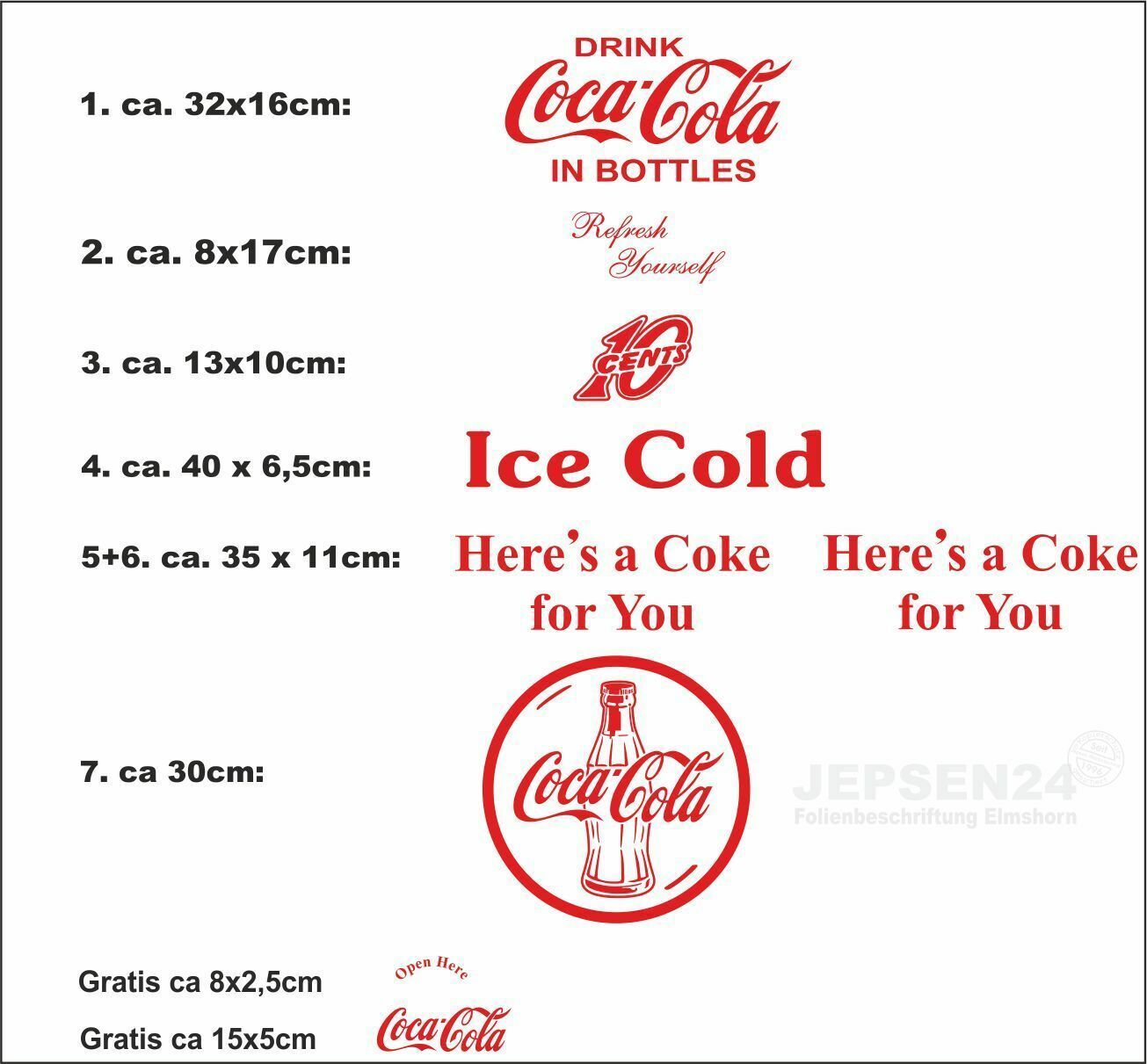 7 teiliges Drink Coca Cola Folienschriften Aufkleber Set 10 Cent K2 / Kühlschrank nicht enthalten / without fridge für Gefrierkombination und Retro Kühlschränke ab ca 90cm Höhe geeignet + Gratis Aufkleber "Open Here" Halbrund ca 8x2,5cm Für Ihren Kühlschrank, Kühltruhen und Automaten. Original wie USA Kühlschrank aus den 50er Jahren oder Türen, Fenster .....