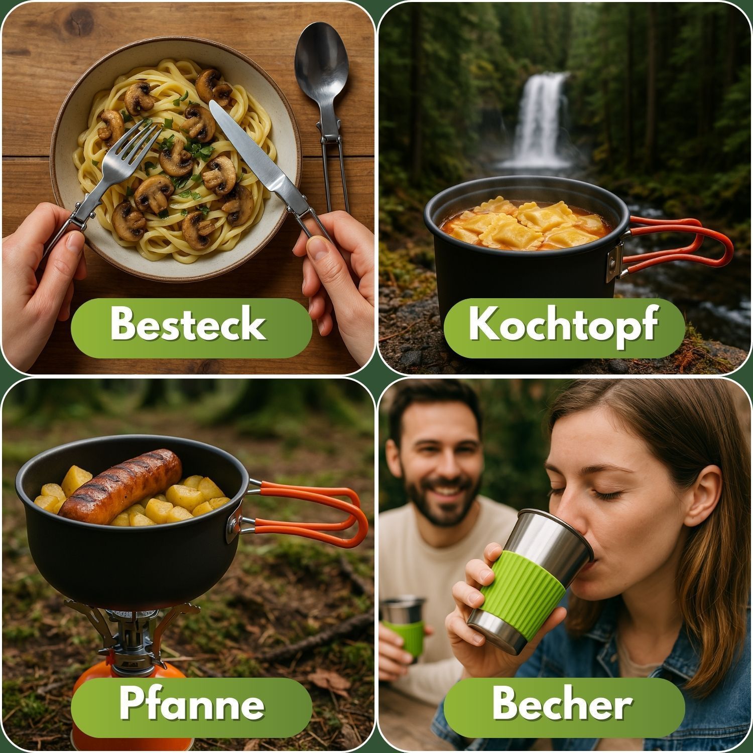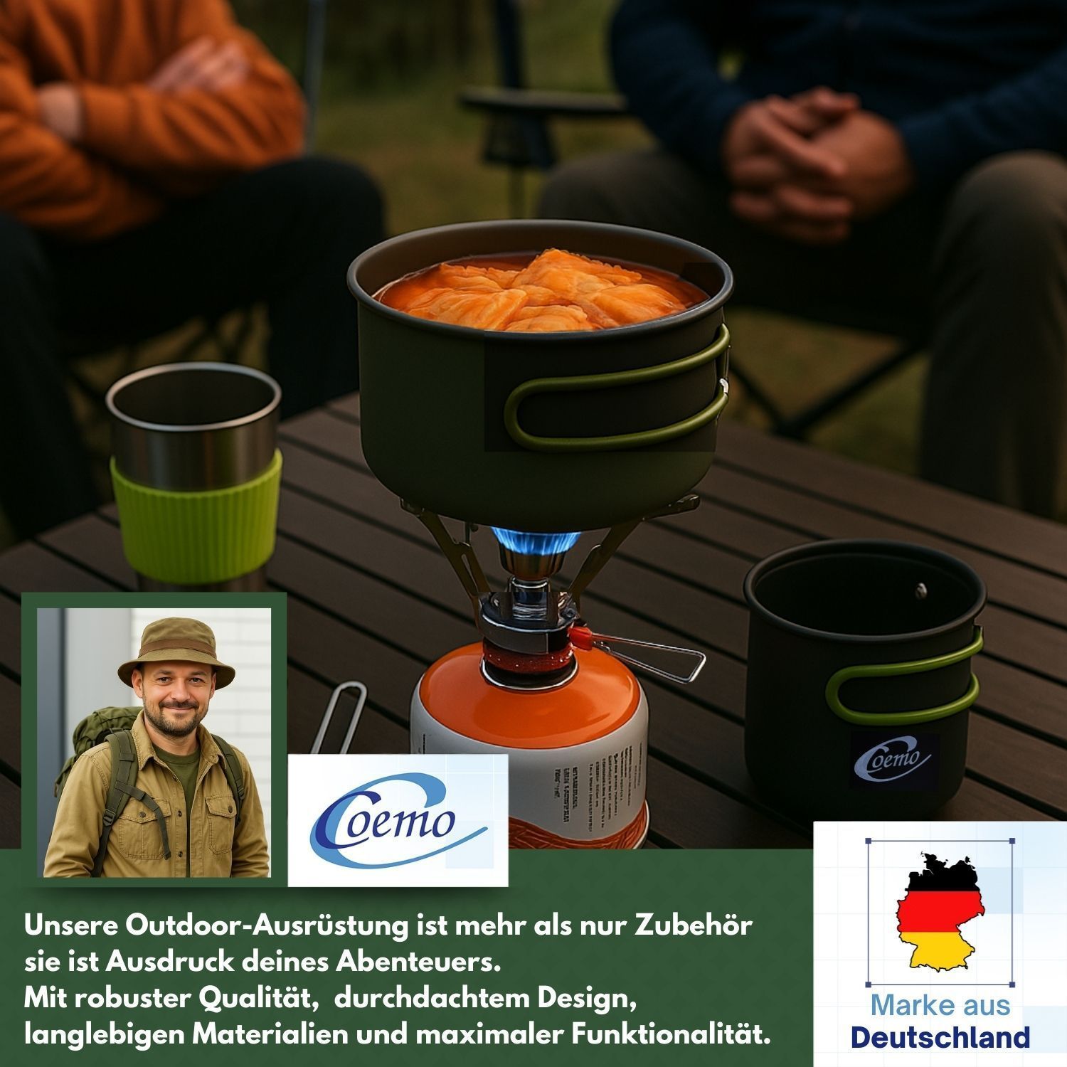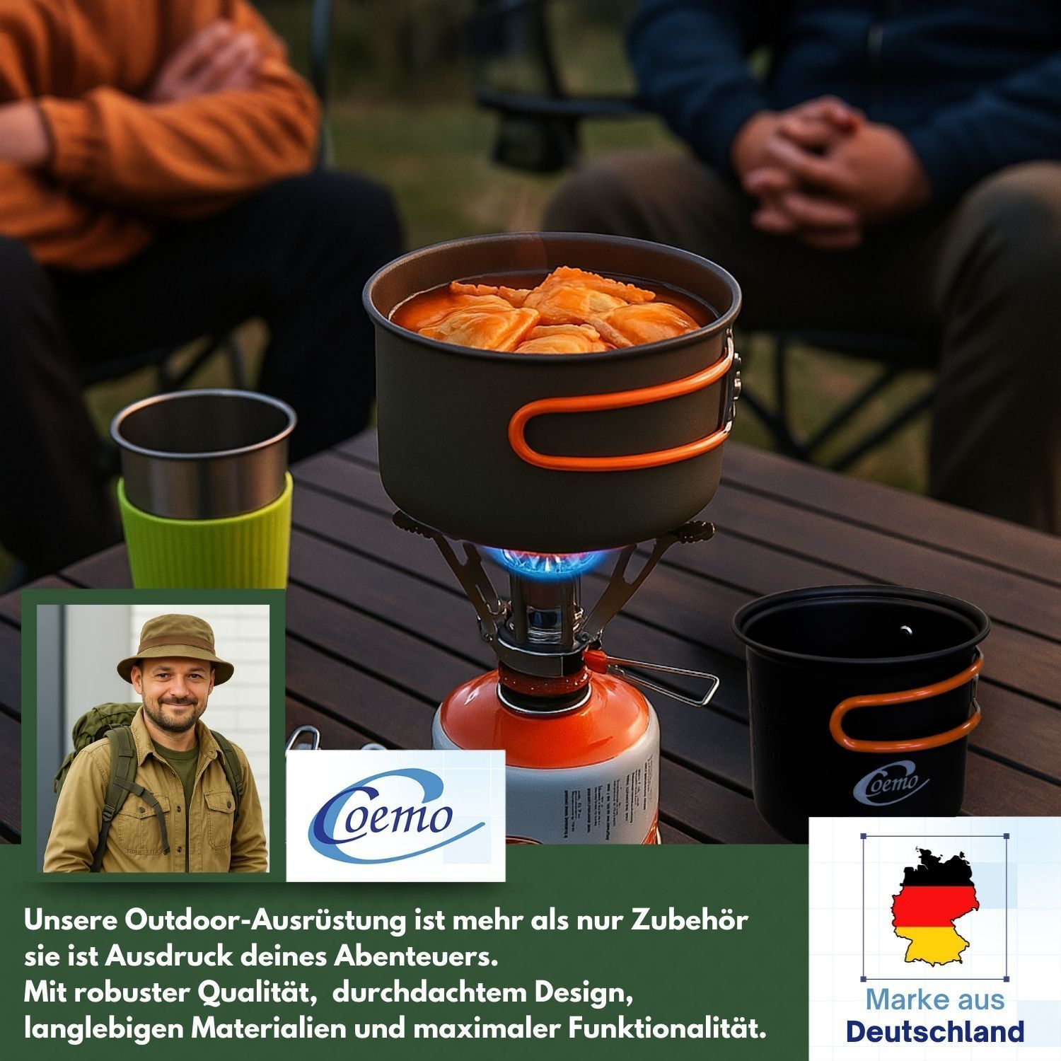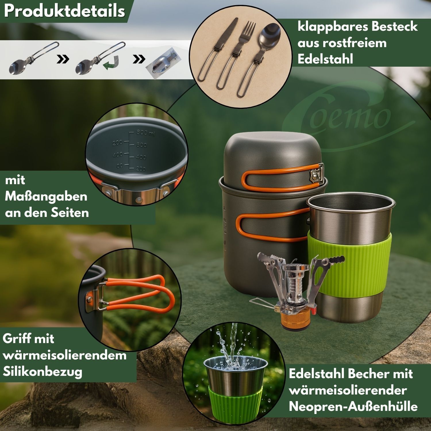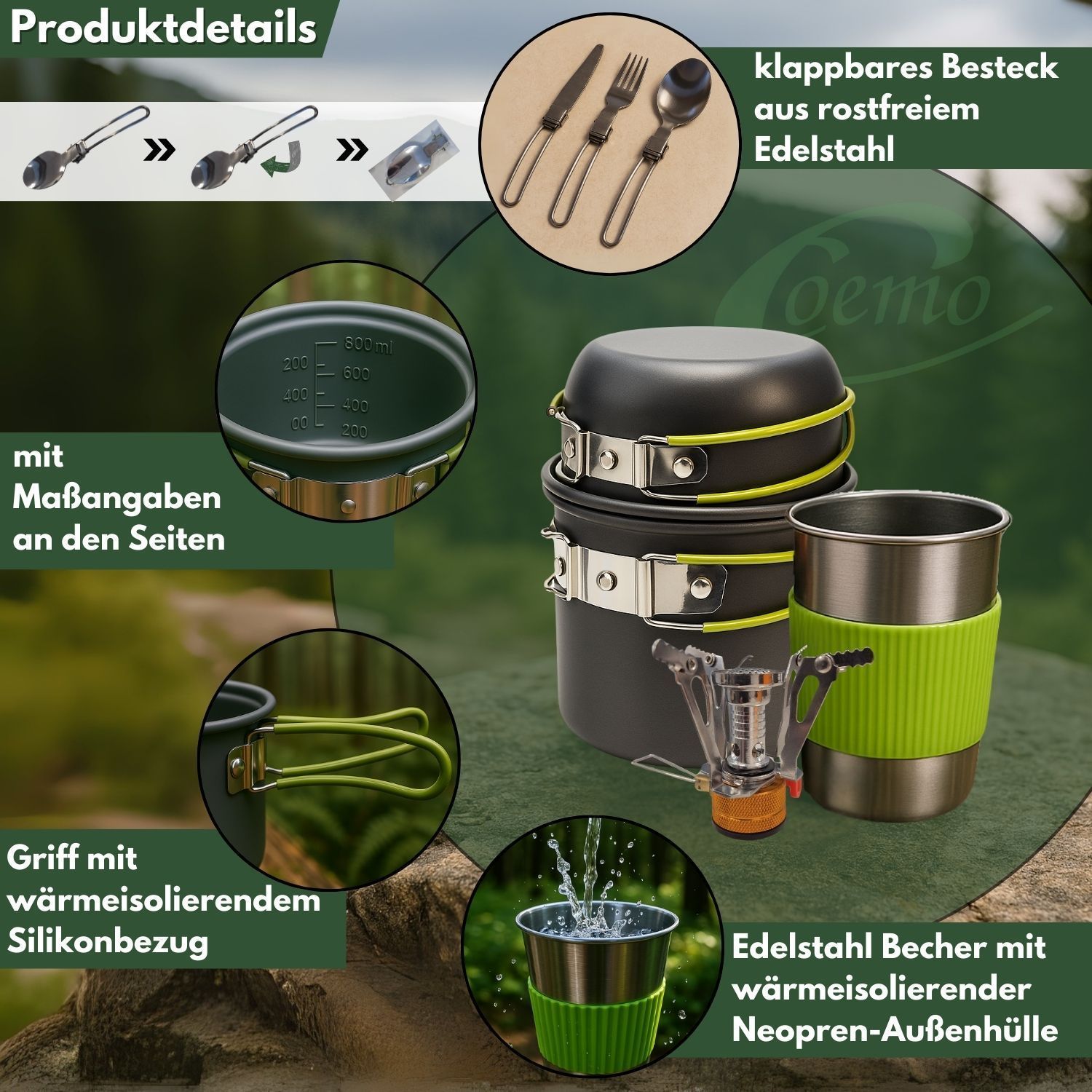 Freiheit schmeckt besser – Kochen unter freiem Himmel Es gibt Erlebnisse, die bleiben – der Sonnenaufgang auf einem Gipfel, das Prasseln des Feuers im Wald, das Lächeln nach einer warmen Mahlzeit mitten in der Wildnis. Genau für solche Momente wurde dieses 7-teilige Camping-Kochgeschirr-Set entwicke