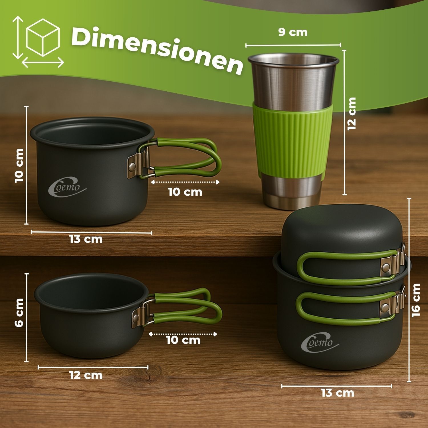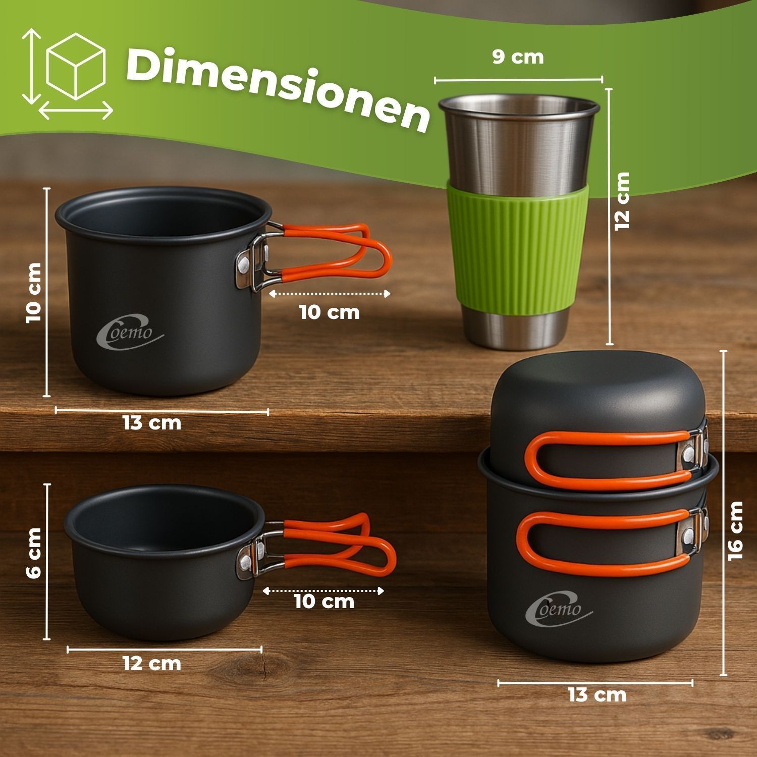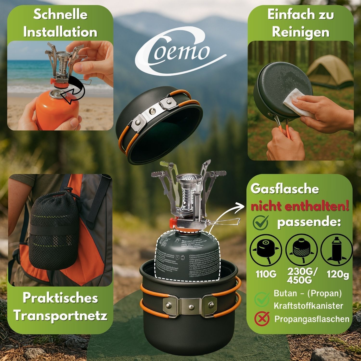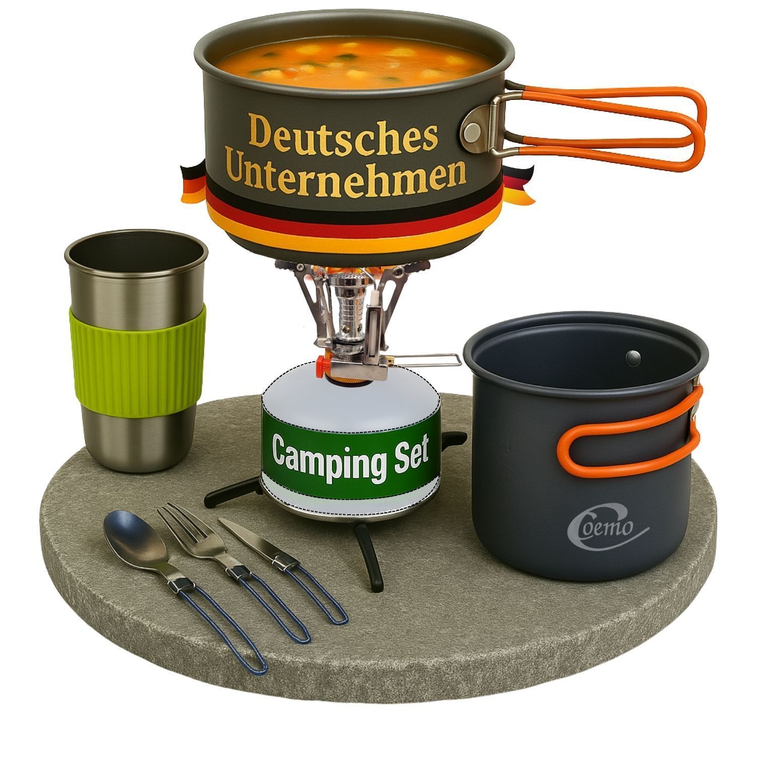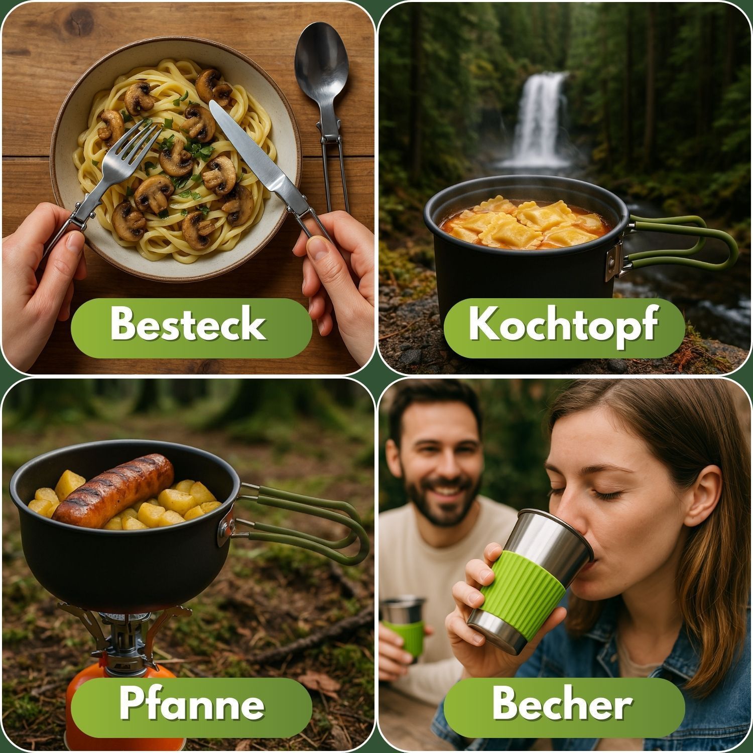 Freiheit schmeckt besser – Kochen unter freiem Himmel Es gibt Erlebnisse, die bleiben – der Sonnenaufgang auf einem Gipfel, das Prasseln des Feuers im Wald, das Lächeln nach einer warmen Mahlzeit mitten in der Wildnis. Genau für solche Momente wurde dieses 7-teilige Camping-Kochgeschirr-Set entwicke