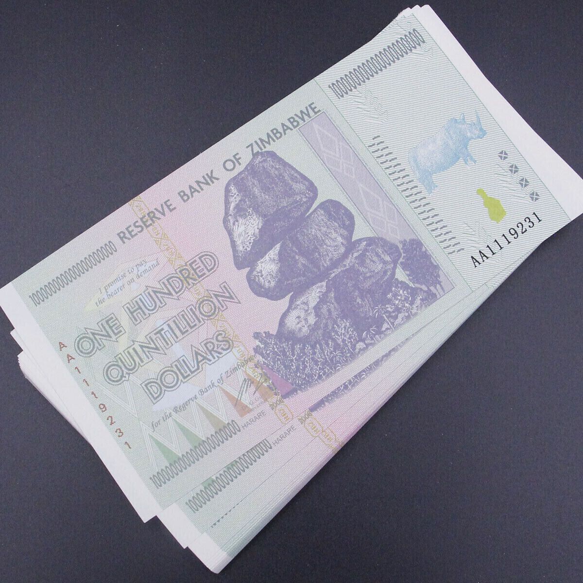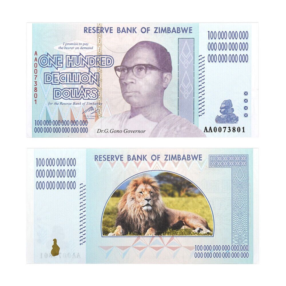 7 verschiedene Zimbabwe Banknote 100 Quintillion Dollars + 100 Decillion + One Myrillion + One Centillion + One Dumillillion + 100 Yottalillion + One Zettalilion Die Scheine haben unterschiedliche Seriennummern. Mehr als ein Jahrzehnt nach ihrer Entmonetarisierung gehören diese Banknoten immer noch