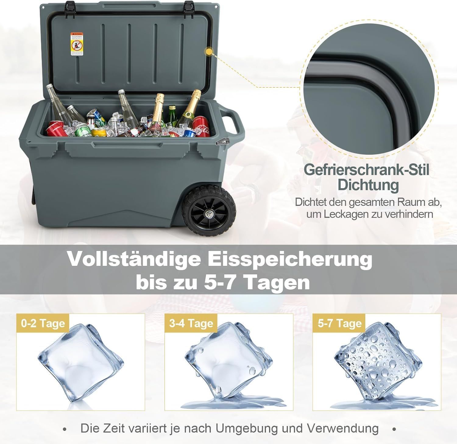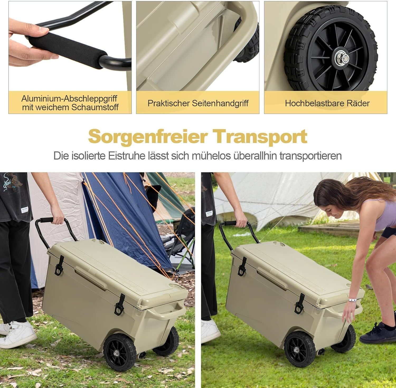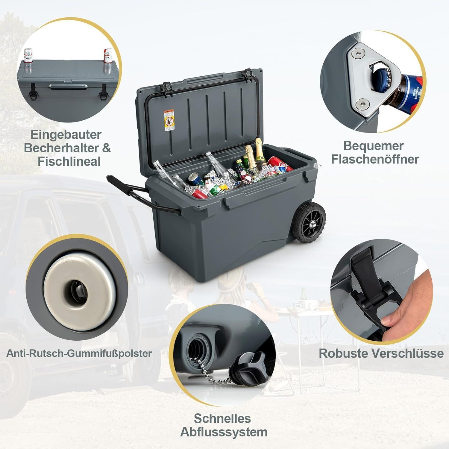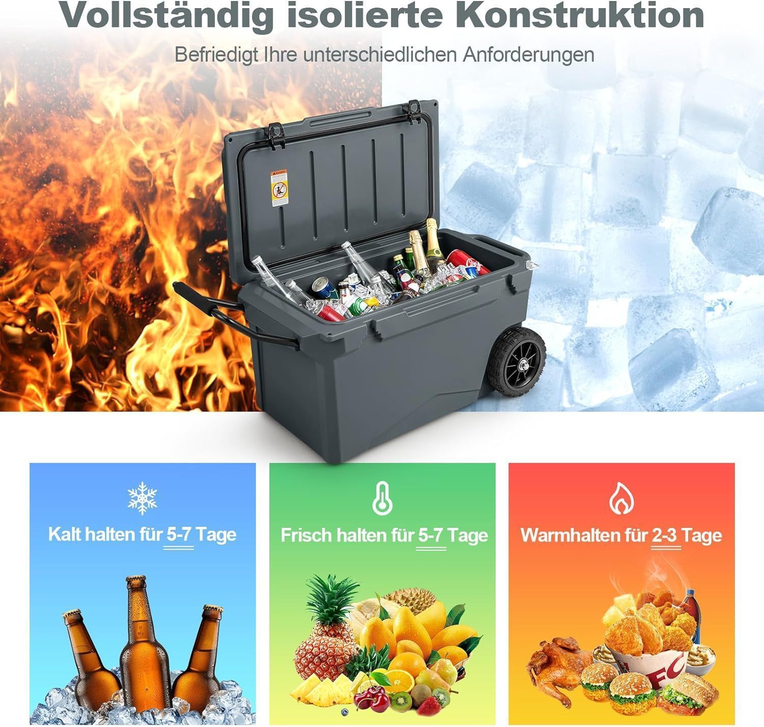 71L Isolierbox tragbar, Kühlbox grau inkl. Alugriff & großen Rädern, Wörmebehälter
