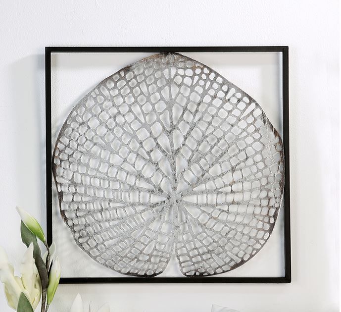 74558 Wand-Deko Leaf aus Metall antik Silber mit 1 Blatt in dunkelbraunem Rahmen