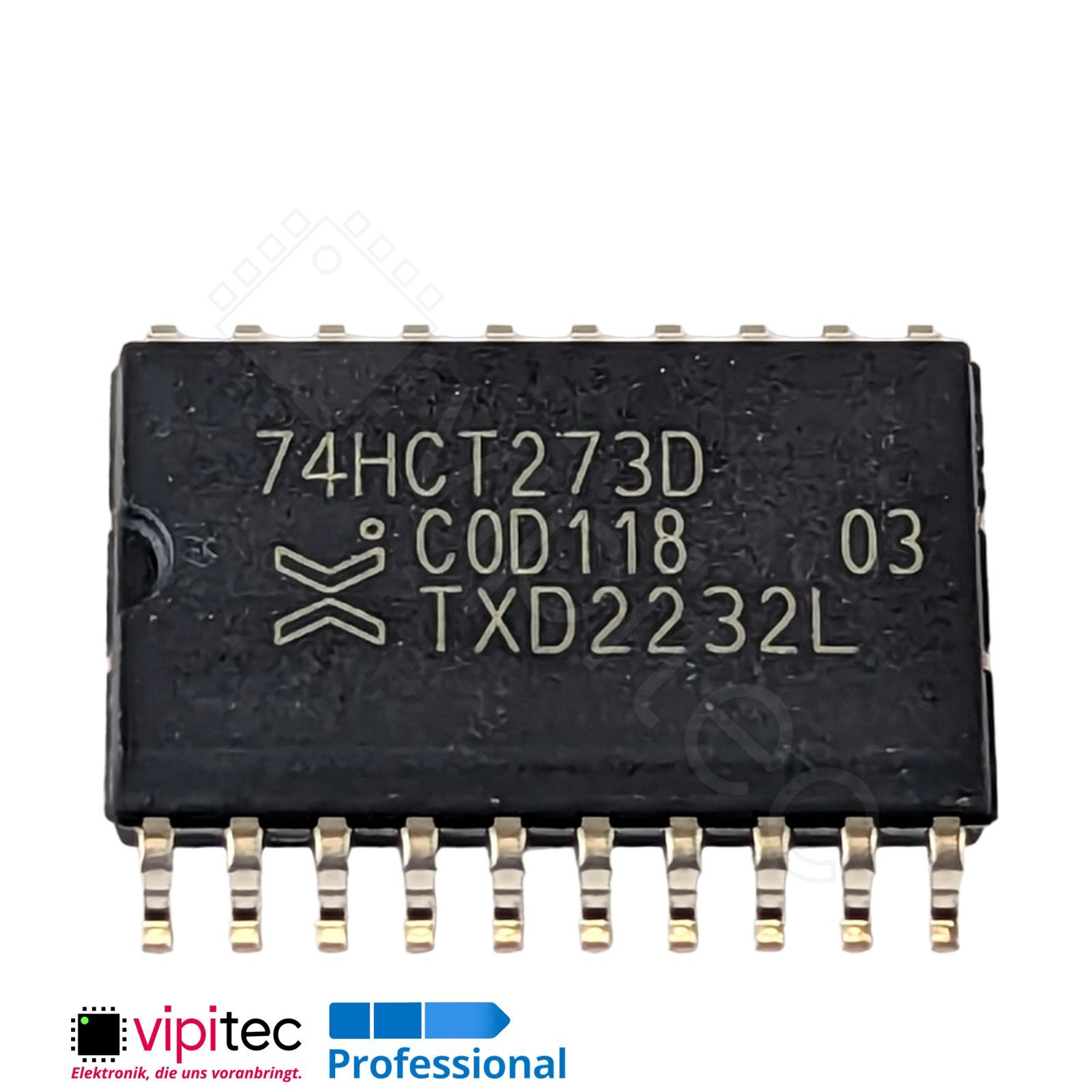 Der 74HCT273 ist ein integrierter Baustein, der acht unabhängige D-Flip-Flops in einem einzigen Gehäuse zusammenfasst. Ein D-Flip-Flop (auch D-Typ-Flip-Flop oder D-FF genannt) ist ein flankengetriggertes, bistabiles Speicherelement, das einen anliegenden digitalen Pegel am Dateneingang (D) bei einer definierten Taktflanke auf den Ausgang übernimmt und bis zur nächsten Taktflanke hält. Solche Bausteine werden im allgemeinen als oktales Register od