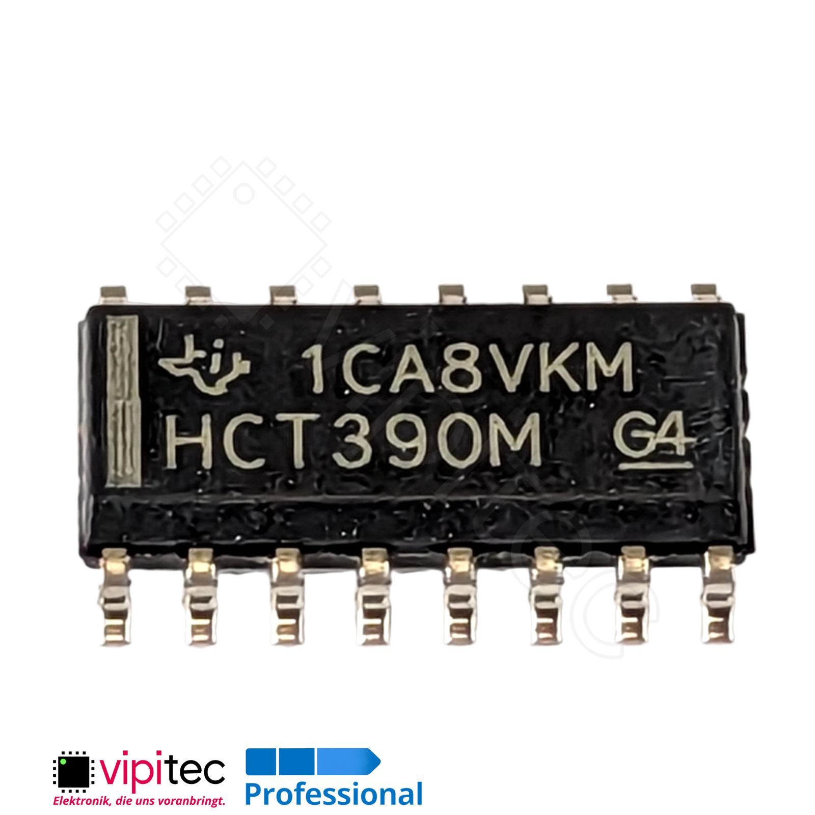 Der 74HCT390 ist ein zweikanaliger, dekadischer 4?Bit?Zähler in SO?16?SMD?Gehäuse, der zwei unabhängige Zähleinheiten in einem Baustein vereint. Als dekadischer Zähler ist er auf Zählfolgen im Dezimalsystem ausgelegt (Zählbereich 0–9), lässt sich aber auch als 4?Bit?Binärzähler einsetzen; gebräuchliche Bezeichnungen sind Dekaden?Zähler, BCD?Zähler oder allgemein Zähler?IC. Das Bauteil eignet sich für Anwendungen wie Ereigniszählung, Frequenzteilu