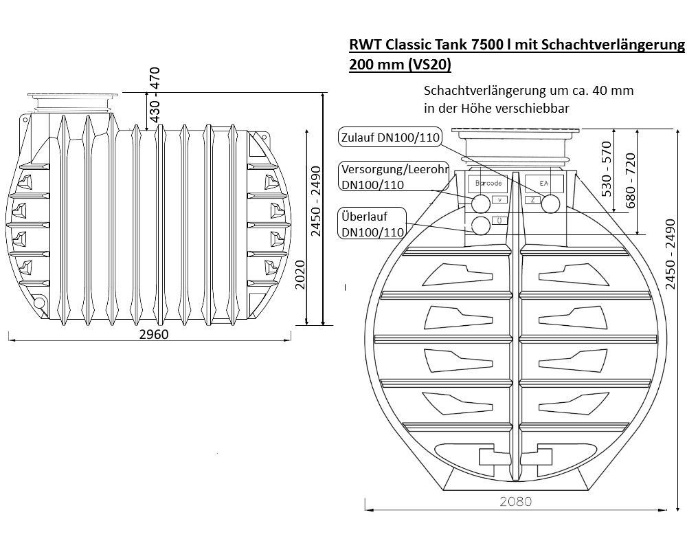 7500 L RWT Classic Tank - Einbau- und anschlussfertiger Tank mit 25 Jahren Garantie* optional mit Schachtaufsatz, Abdeckung und Filter. Die Behälter werden aus 100% homogenem (sortenreinem) Polyethylen-LLD Recyclingmaterial gefertigt und schonen nicht nur Wasser- sondern auch Rohstoffreserven. Der RWT Classic Tank ist für den einfachen Grünbereich bis zur LKW-Befahrbarkeit geeignet und kann bis zu 1/3 ab Tankboden im Grundwasser eingebaut werden (Anleitung beachten).