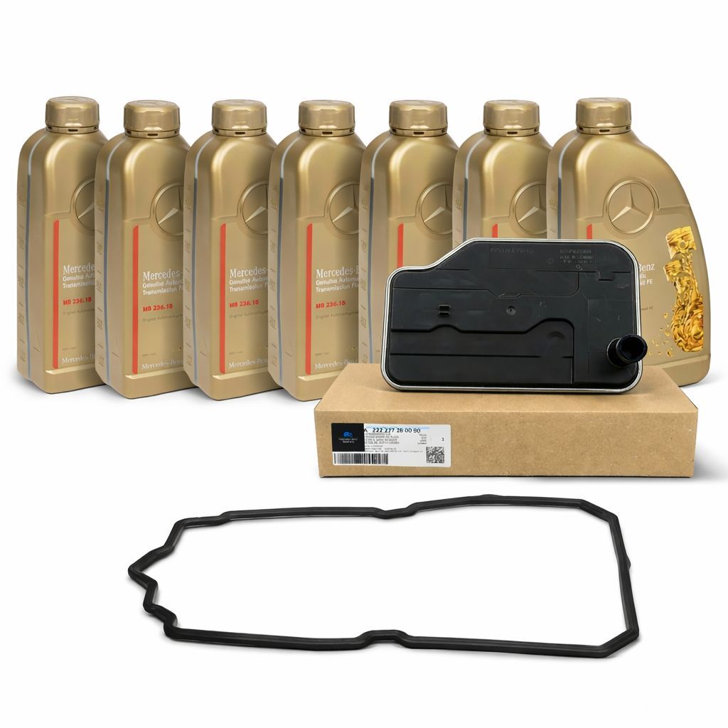 Automatikgetriebe Ölwechsel Set für Mercedes 7-Gang 722.9 – 7L Original Mercedes Benz 236.15 ATF Öl + Original Mercedes Benz Getriebeölfilter + Ölwannendichtung Komplettset für Wartung und Ölwechsel – passend für viele Mercedes-Benz Modelle mit 7-Gang-Automatikgetriebe (722.9) Lieferumfa