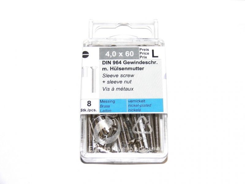 8 Hülsenschrauben M4 x 60 , mit Hülsenmutter , Messing vernickelt, DIN 964