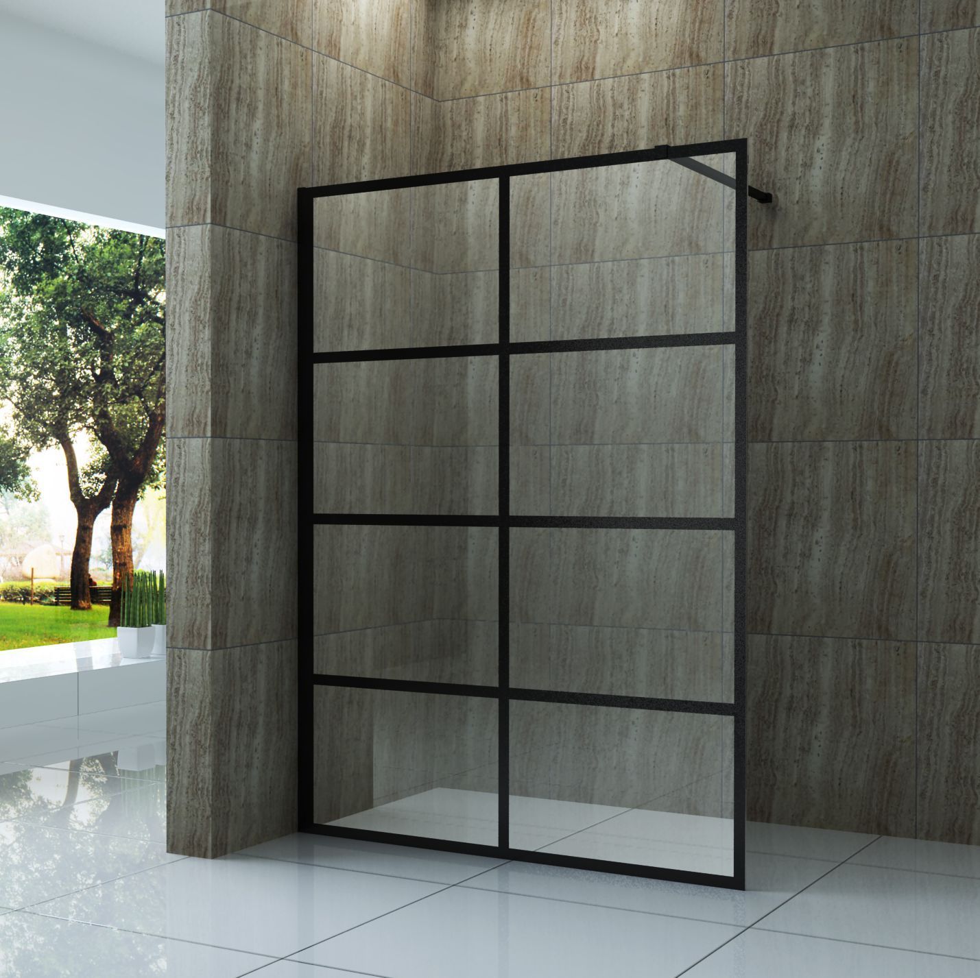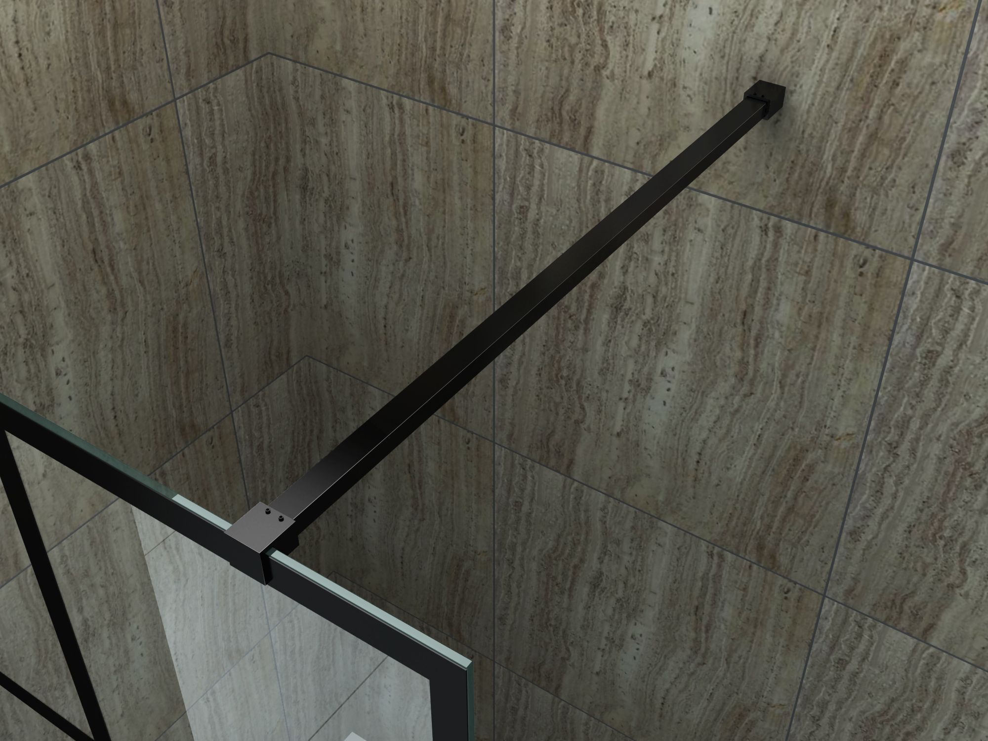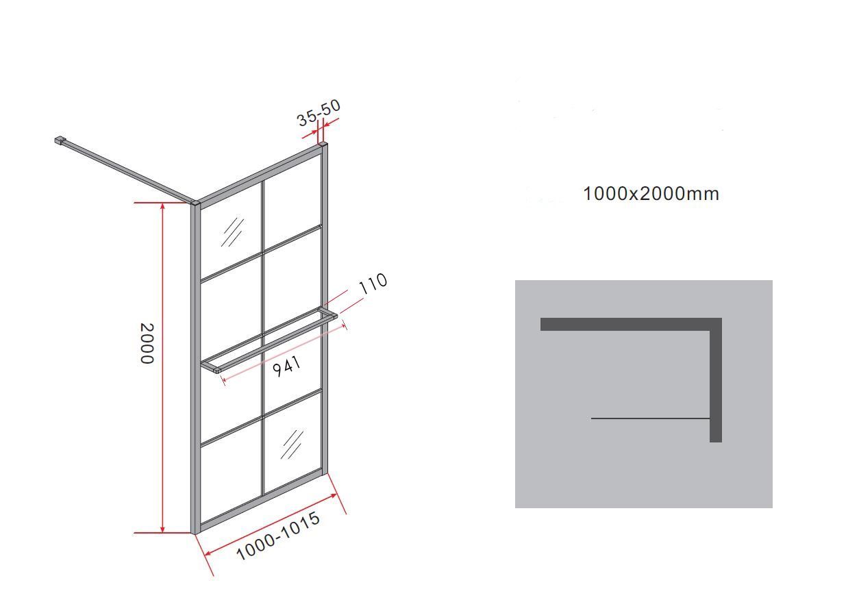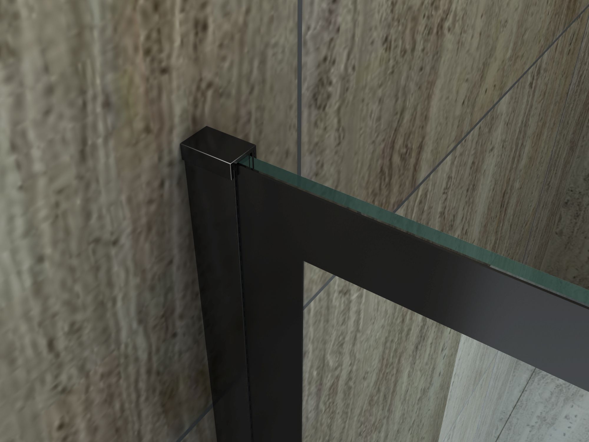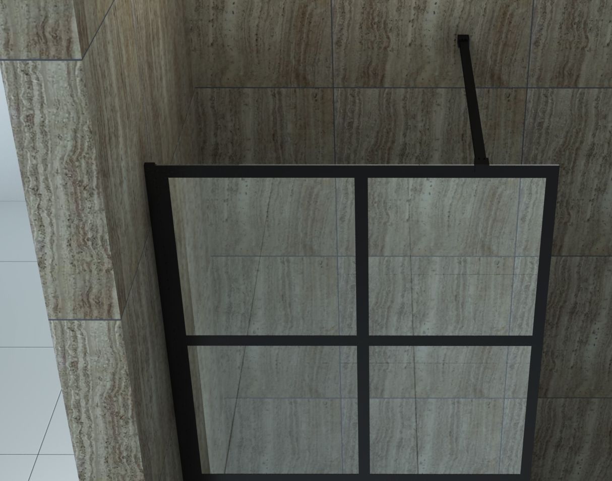 modernes, industrielles Design Glasscheibe aus 8 mm dickem Sicherheitsglas (ESG) Easy-Clean Oberflächenbeschichtung Aluprofil und Haltestange, schwarz matt lackiert schwarzer Rahmen im Glas lackiert bis zu 15 mm Wandausgleich (+15 mm) leichte Montage, auch ohne Fachkenntnisse Links- oder Rechtsmonta