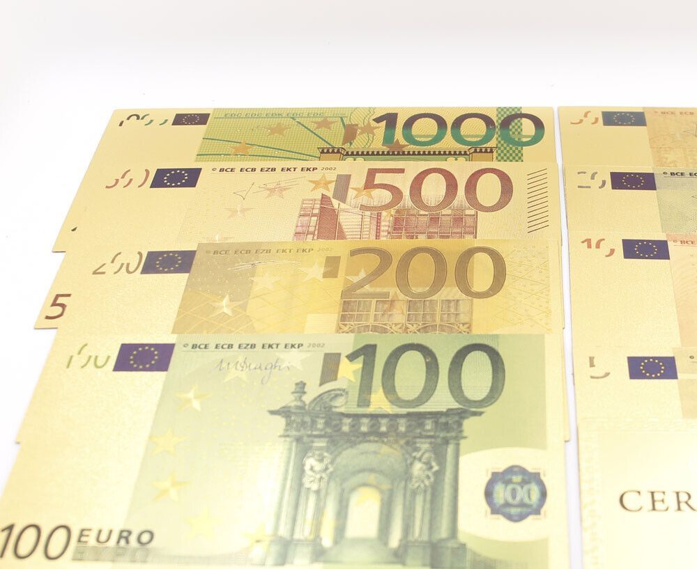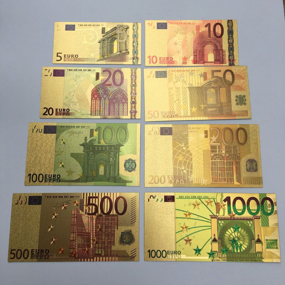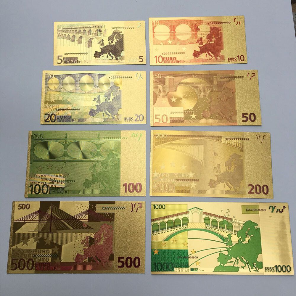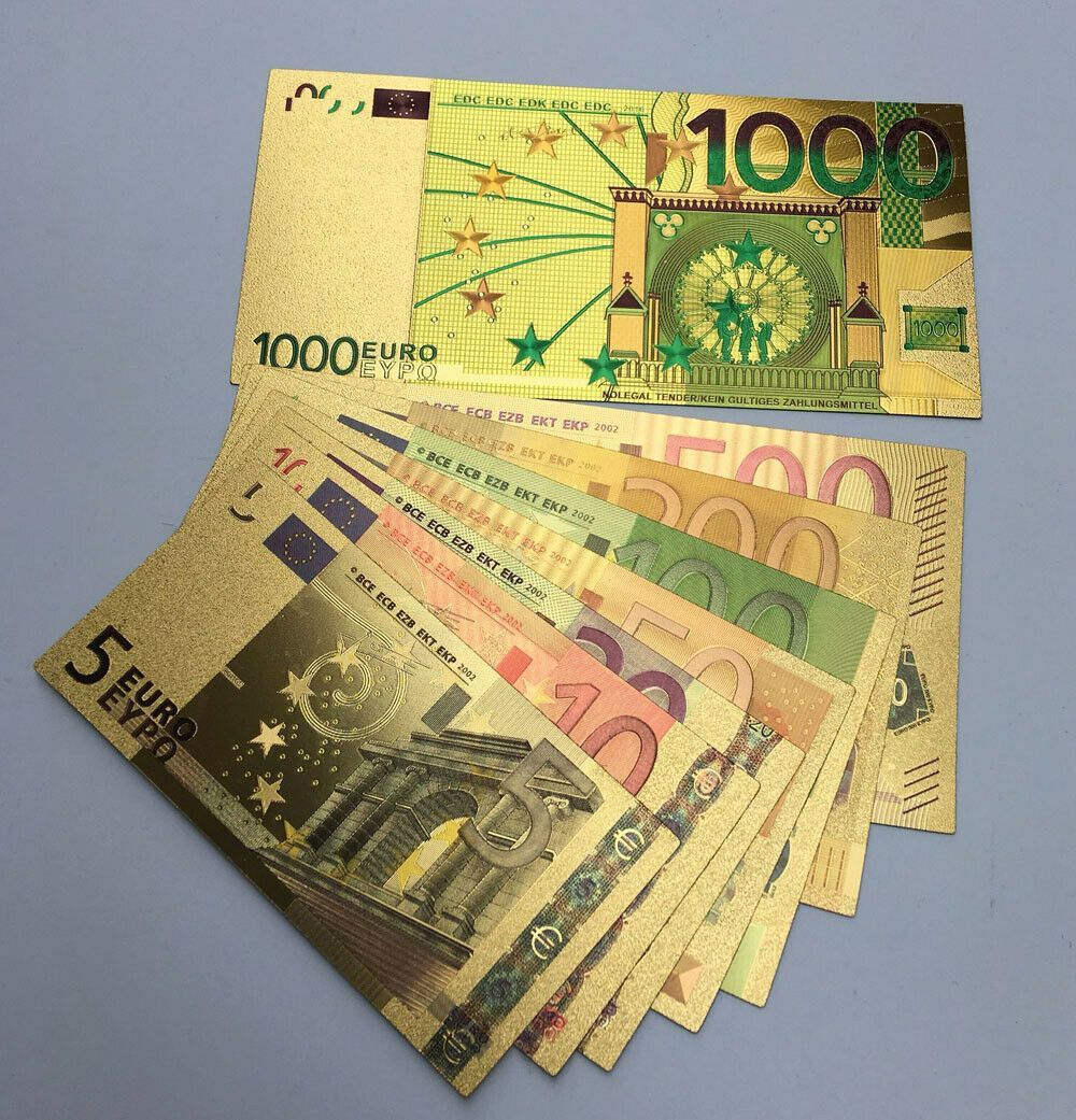 Satz mit 8 Scheine - Euro Banknoten - vergoldet Folie - sehr selten 5 bis 1000 Euro Gold Plated mit Farbe Technische Information zum Artikel Material: vergoldet Größe: original Größe Erhaltung: Neu Verpackung: Folie Das ideale Geschenk oder natürlich auch zum selber sammeln Natürlich handelt es sich