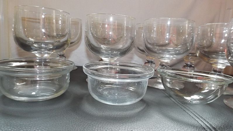 8 Kaviarschalen, Obstschalen mit 3 Einsätzen . Höhe des Glases ca. 14 cm. Durchmesser ca. 10,5 cm. Ein Glas hat leider ein Sprung. Siehe Foto.