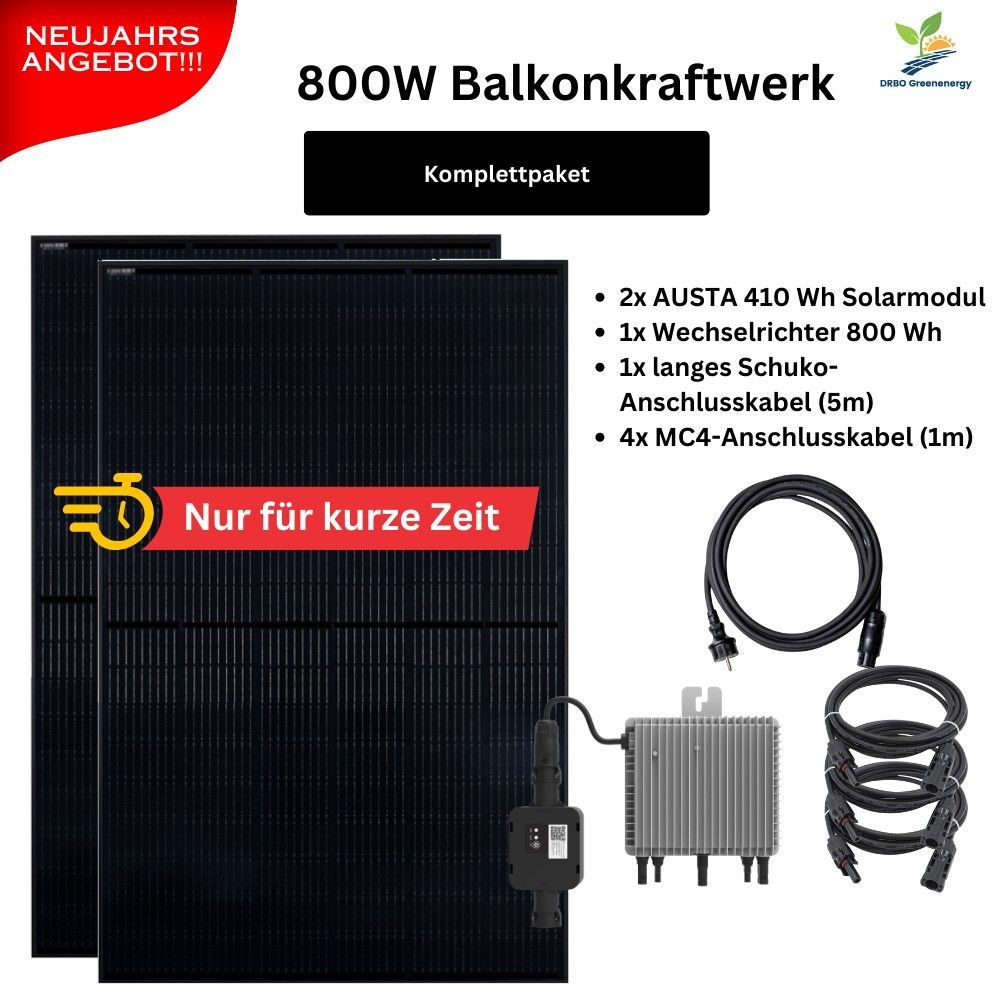 Starten Sie ins Jahr 2024 mit unserem exklusiven Neujahrsangebot: 800W Balkonkraftwerk: Werden Sie zum Produzenten Ihres eigenen Stroms. Wechselrichter: SUN-M80G3-EU-Q0 WIFI & App-Steuerung 2x 410Wp Solarmodule Langfristige Garantie: 12 Jahre Produkt-, 25 Jahre Leistungsgarantie. Einfache Installation: Einfacher Anschluss durch Laien Exzellenter Kundenservice: