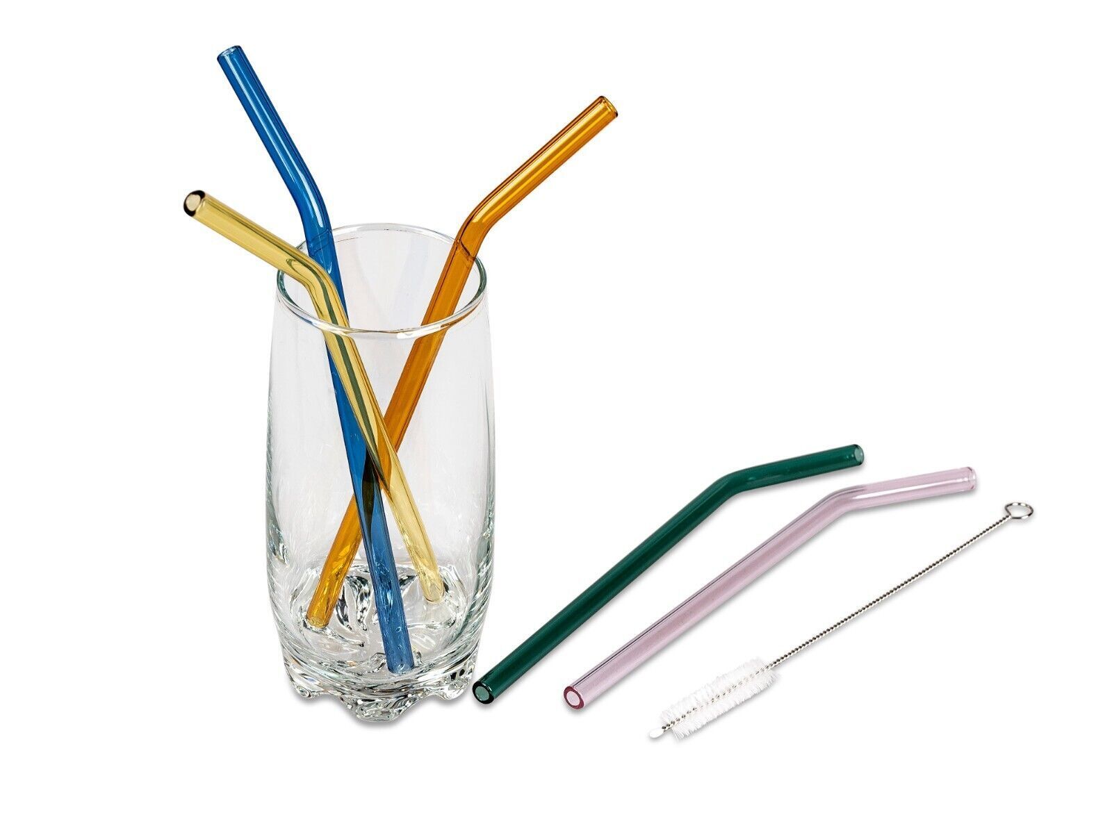 formano 809919 Set 5 Trinkhalme mit Knick + Bürste 20cm a. buntem Glas im Geschenkkarton