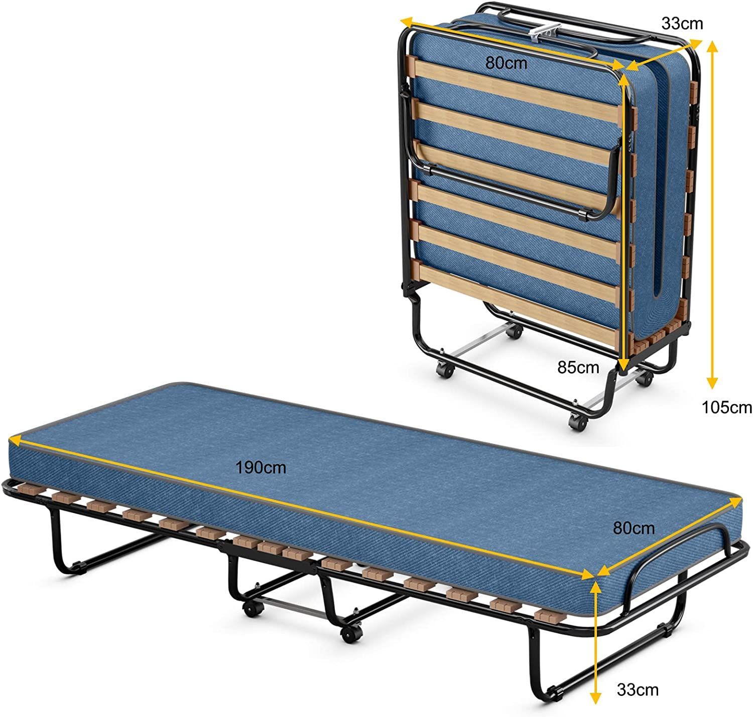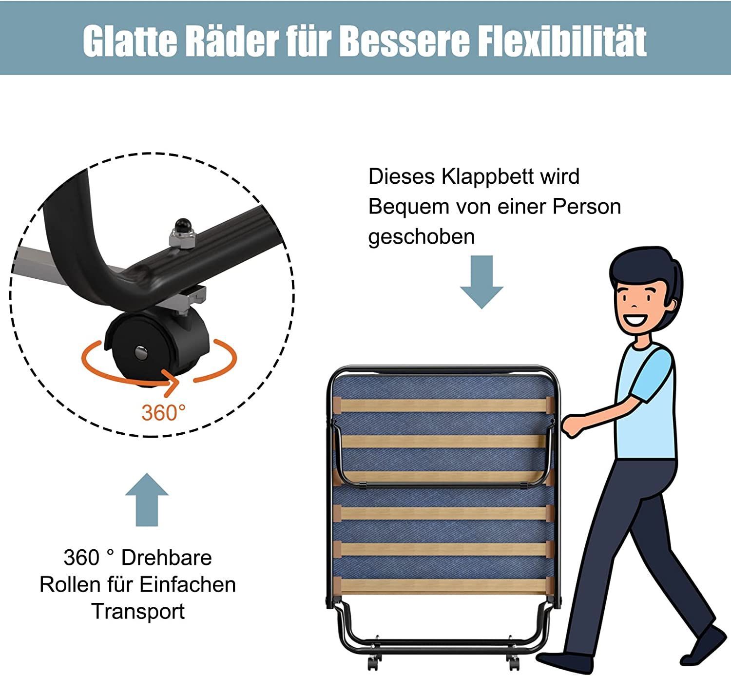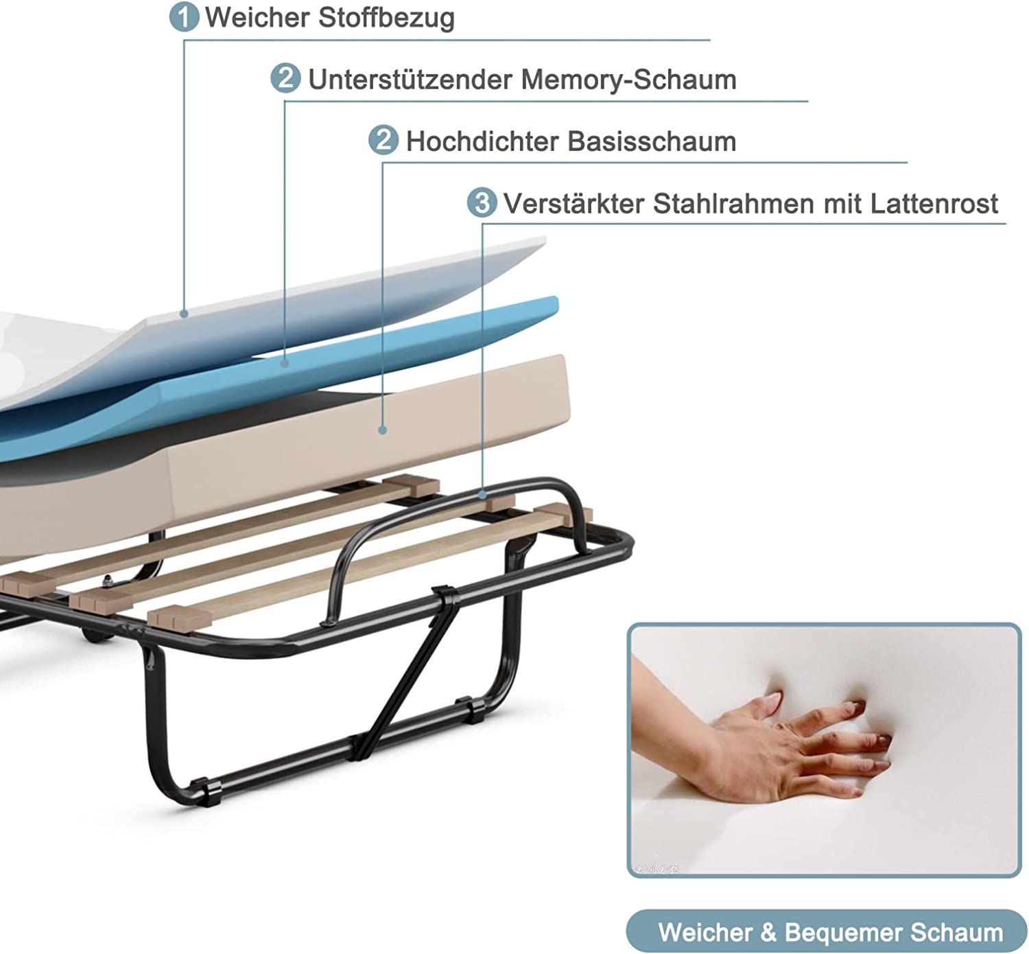 80x190cm Gästebett mit Matratze aus Rückstellschaum, Klappbares Einzelbett Metallbett