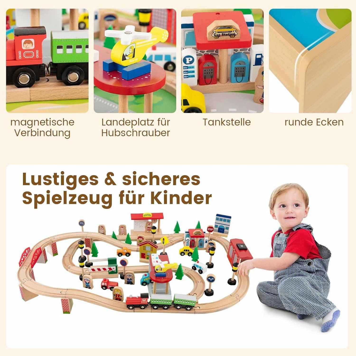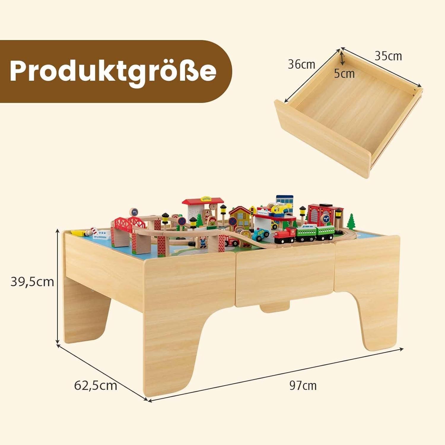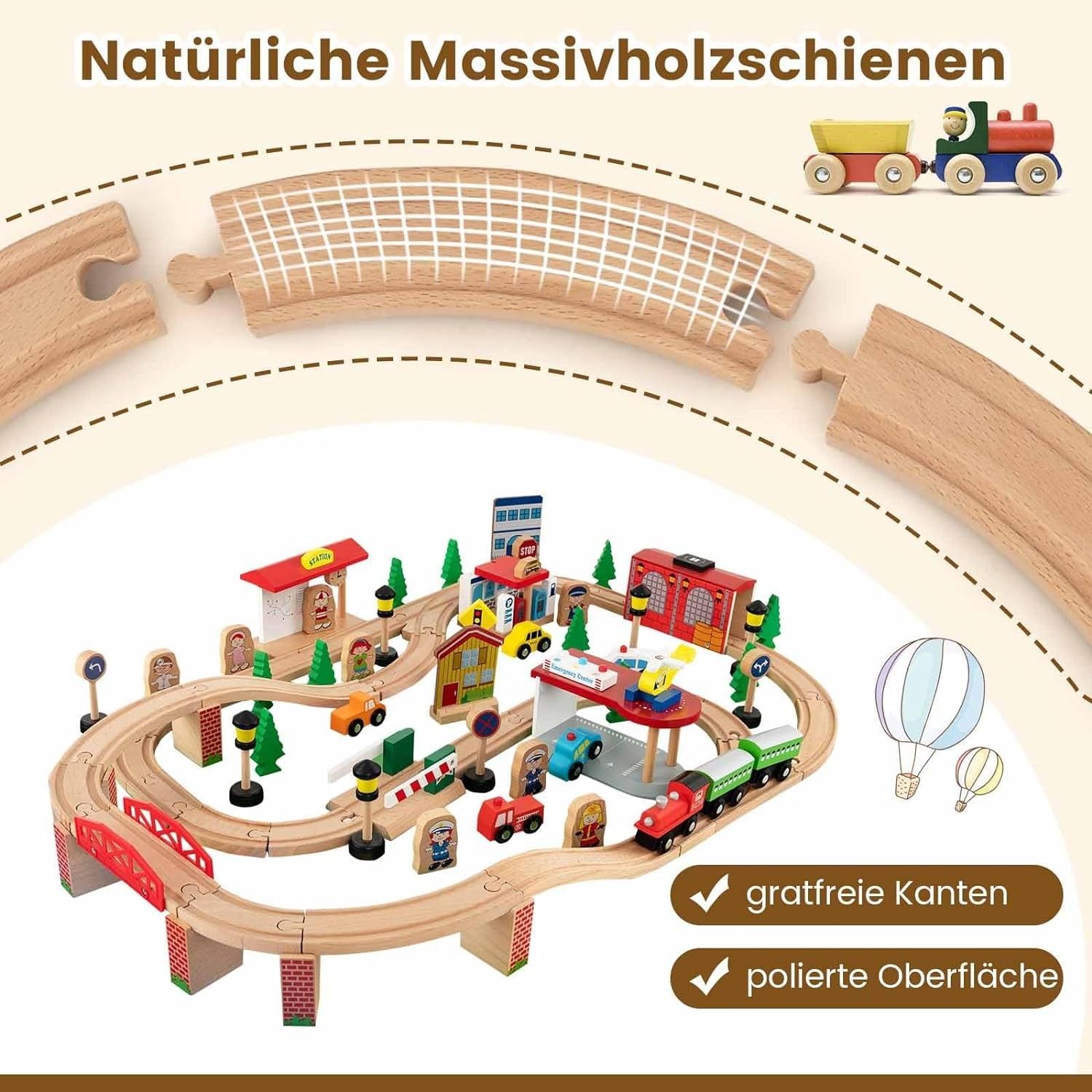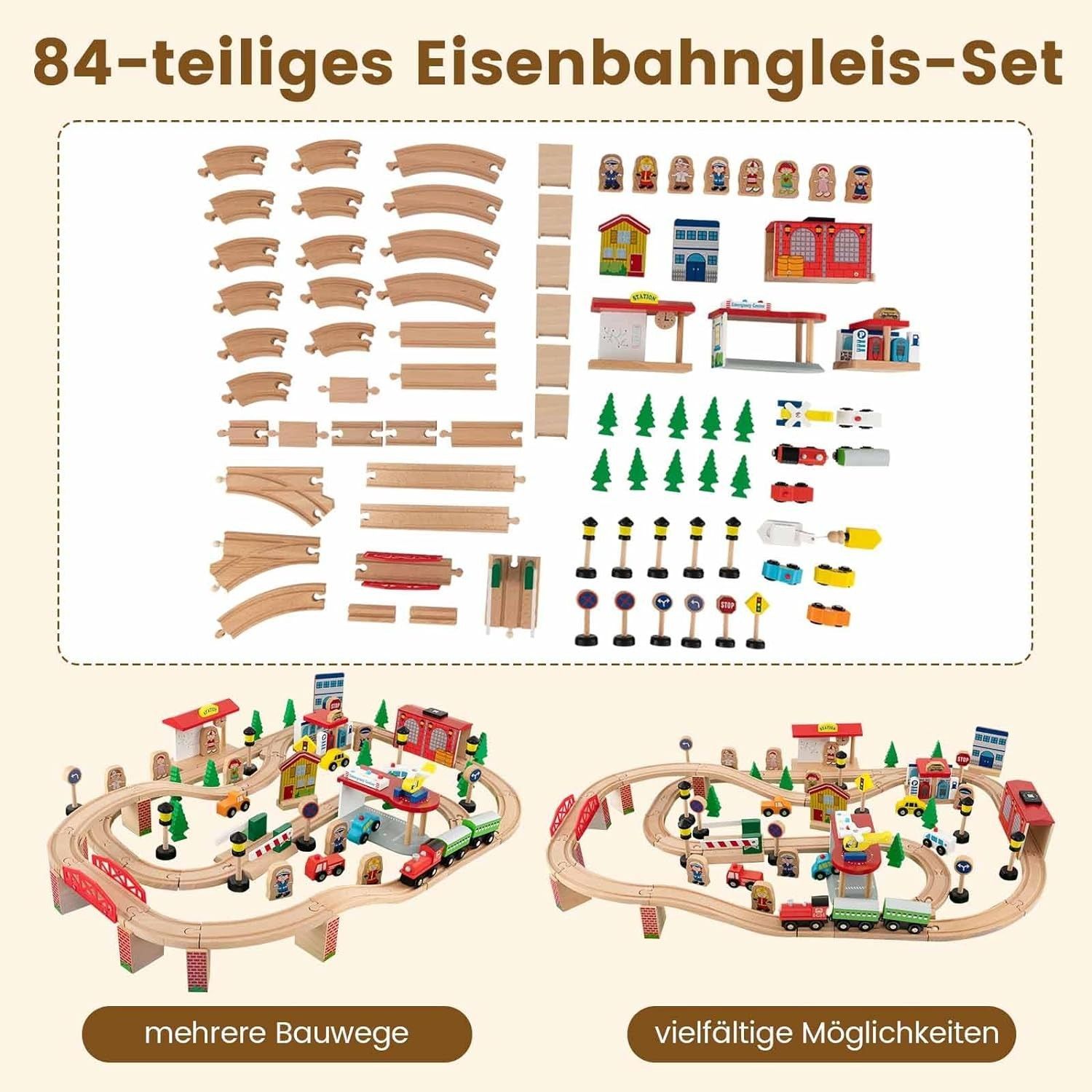 84-teiliges Kinder Eisenbahn Set, Spieltisch aus Holz, Holzeisenbahn Zug Spielzeug