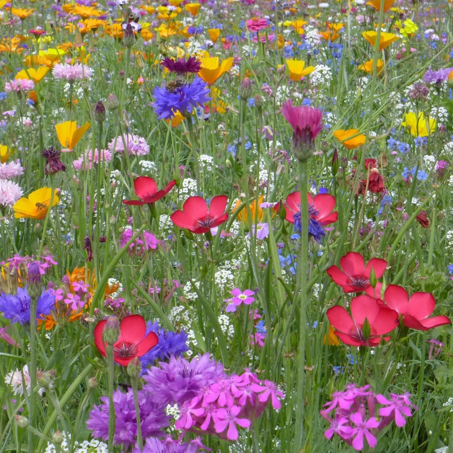 Blumenwiesen Mix (bis zu 35 Arten Sorten) Die Blühmischung enthält z.B: (z.B. Blauglöckchen, Mittagsblumen, Spiegelei-Blume, Duft-Resede, Buschwinden, Goldmohn, Meerviole, roter und blauer Lein, Schleierkraut, Marienkäfer-Mohn, Kornblumen, Ringelblumen, Schmuckkörbchen, Kapmargeriten, ...) Ein Dorad... Mehr