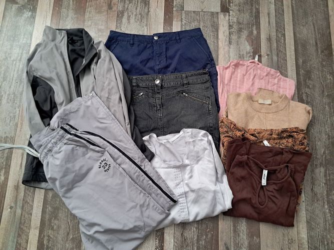 Ich biete hier dieses Damenpaket mit folgendem Inhalt: Minirock, dunkelblau Jeansminirock, grau Langarmshirt in altrosa, ungetragen T-Shirt, braun Pulli in sandfarbe, leichtes Glitzer Tunika, mehrfarbig silberne, elegante Bluse 2tlg. Trainingsanzug Alle Teile (außer dem Langarmshirt) wurden getragen
