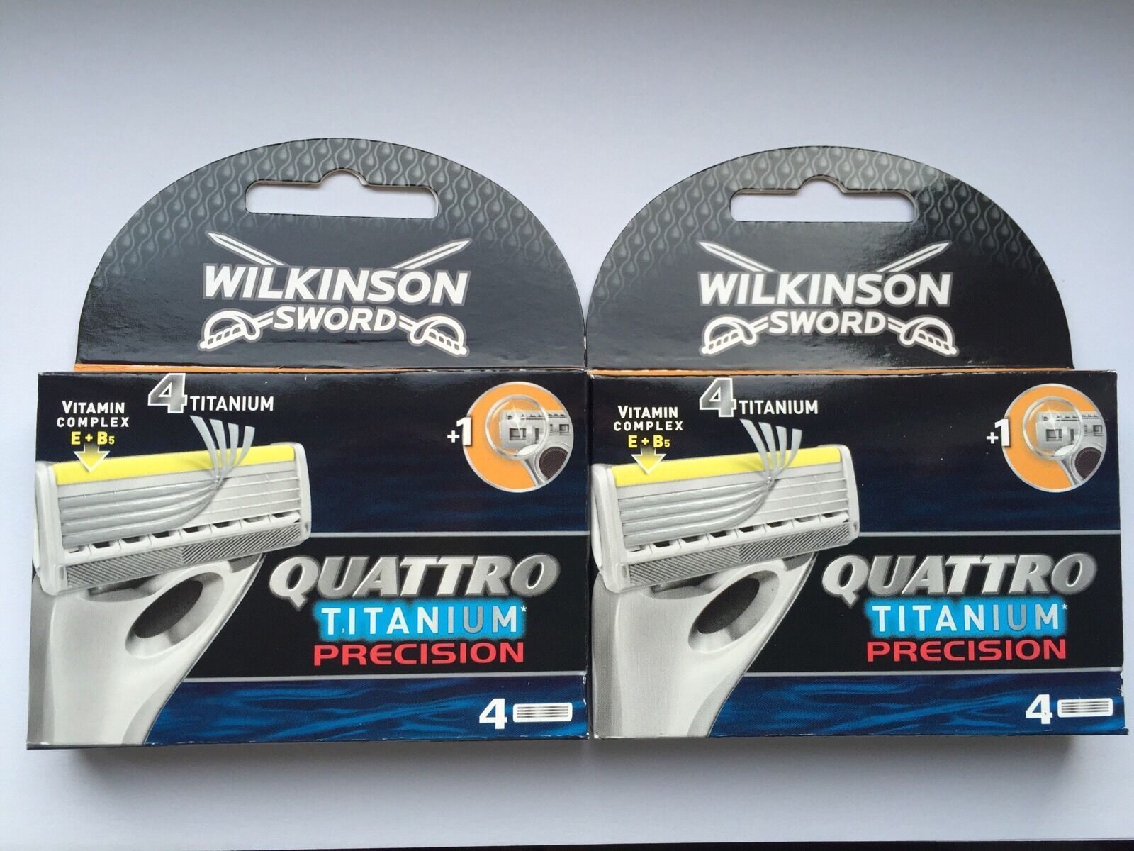 Euro Wilkinson Quattro Titanium Precision Rasierklingen, 2er Pack x 4 Euro Euro Euro 4-Klingen-Rasiersystem mit pflegendem Gleitstreifen Euro Titan-Carbon-beschichtete Klingen für sanfte und gründliche Rasur Euro langlebige und besonders scharfe Klingen für optimalen Schutz vor Hautirritationen Euro