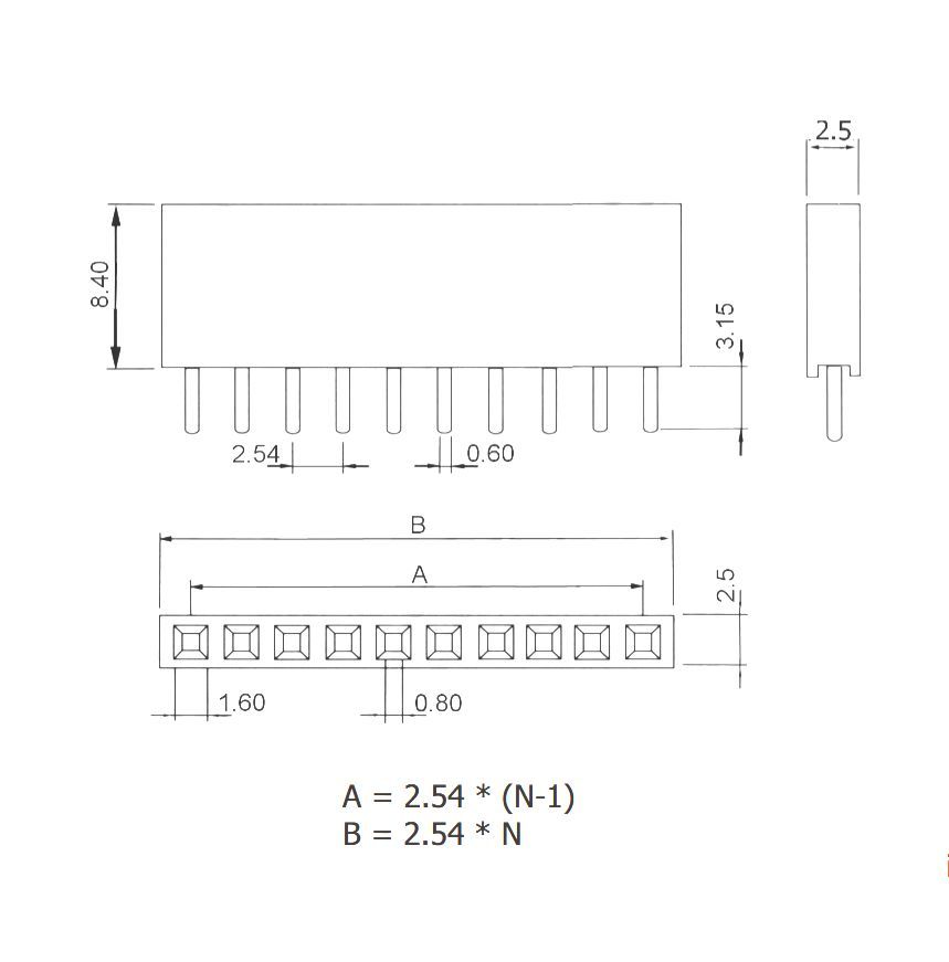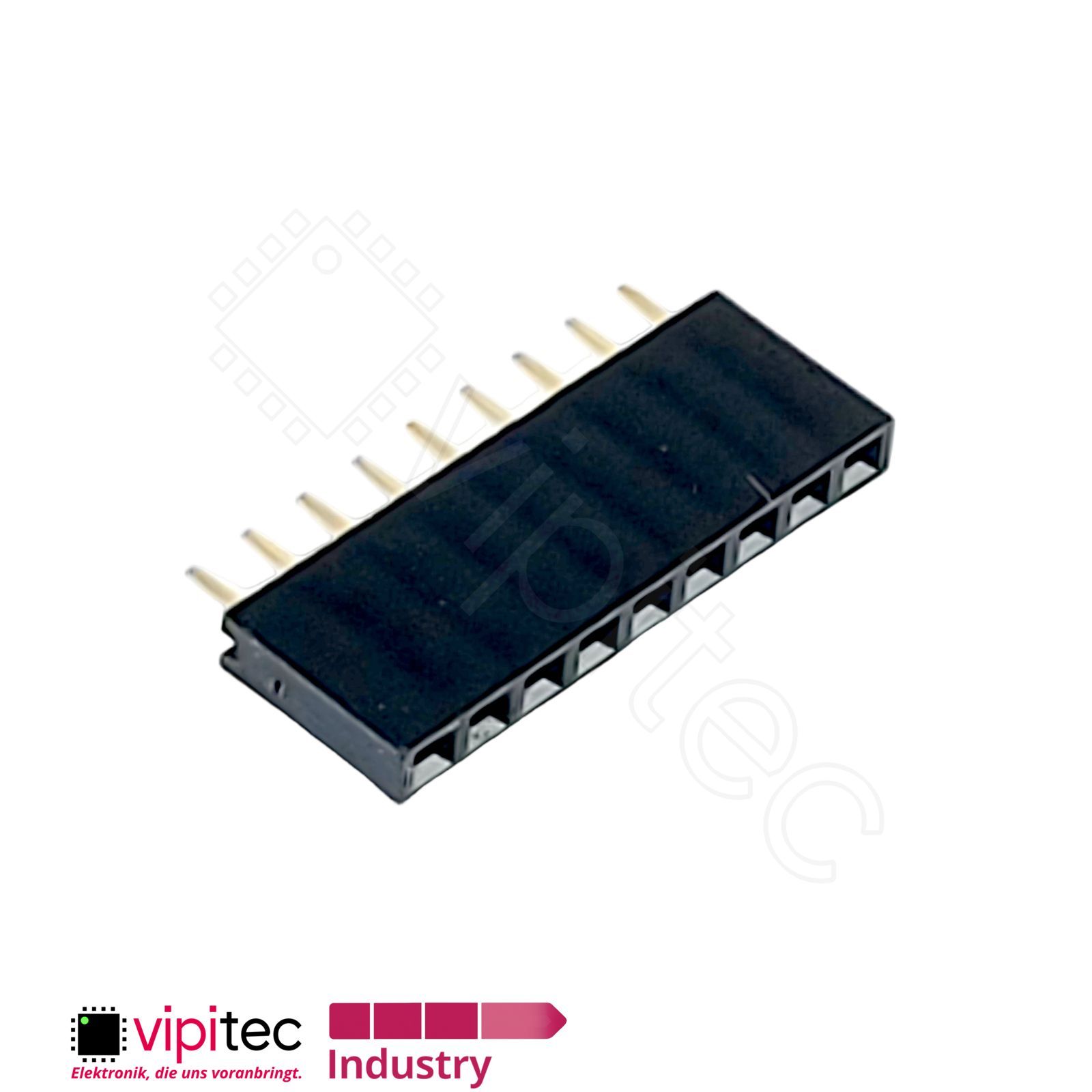 Bei dieser 9-poligen, einreihigen Buchsenleiste handelt es sich um eine gerade, durchsteckbare Female Single Pin Socket Header-Ausführung, die als verbindendes Bauteil auf Leiterplatten eingesetzt wird. Im allgemeinen Sprachgebrauch wird sie auch als Buchsenleiste oder Female-Header bezeichnet und dient dazu, männliche Stiftleisten oder passende Steckgehäuse aufzunehmen. Das Rastermaß von 2,54 mm (entspricht dem gebräuchlichen 0,1"-Raster) macht