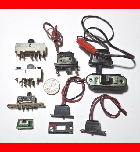 Habe mal etwas aufgeräumt und biete hier 9 Stück kleinste Schiebe-Schalter für RC-Modellbau als Aus- oder EIN-Schalter. Zum Größenvergleich siehe den Cent in der Mitte. Beim Gewinn mehrerer Auktionen wird natürlich nur einmal Porto berechnet und Sie bekommen deswegen eine Nachricht von mir. Ein Zwis