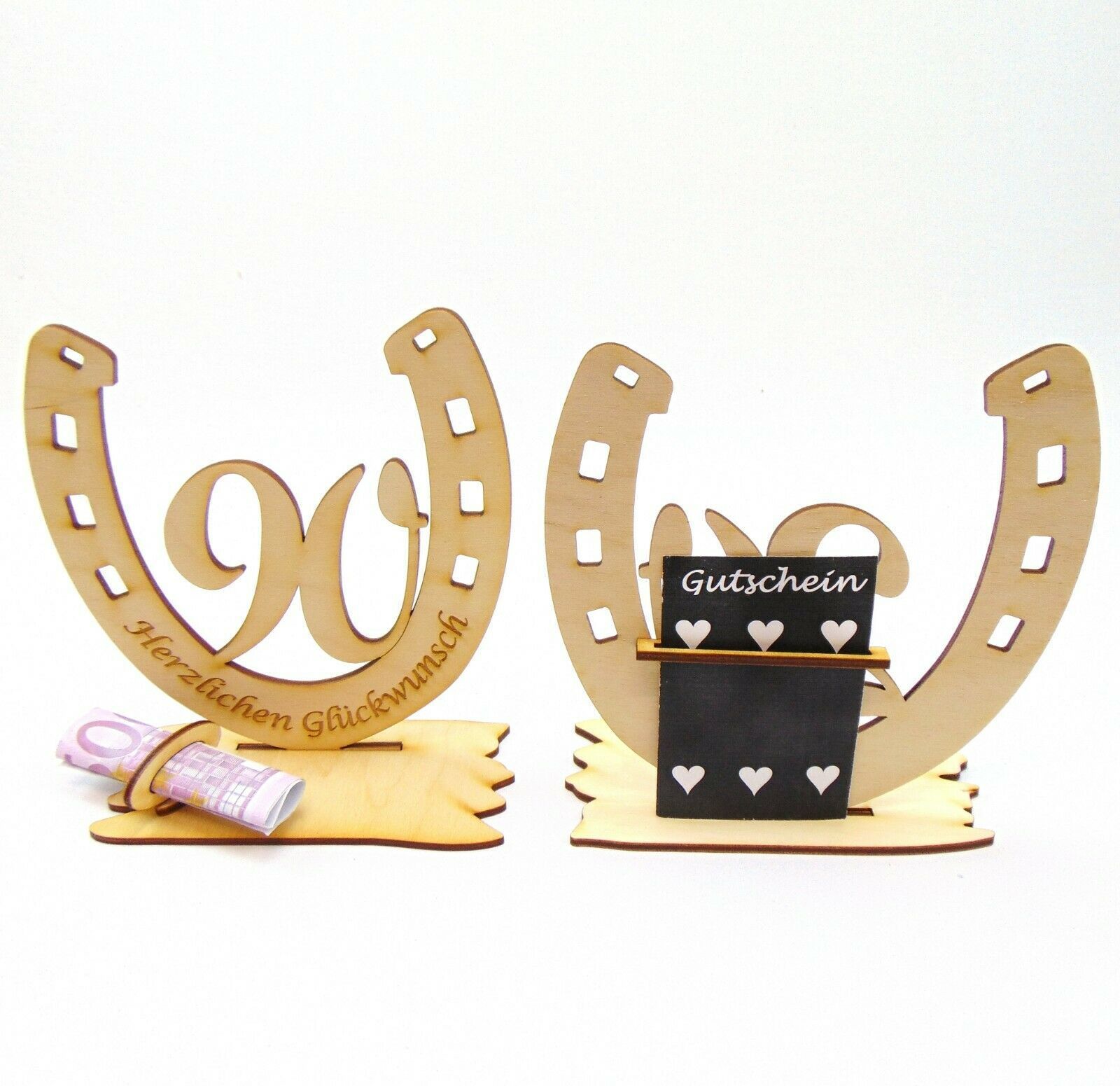 90 Geburtstag, Tischaufsteller Hufeisen aus Holz Glücksbringer