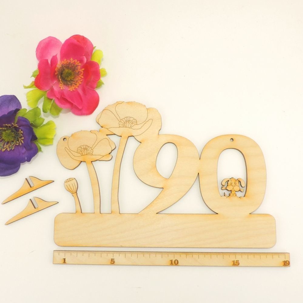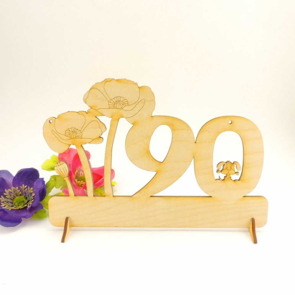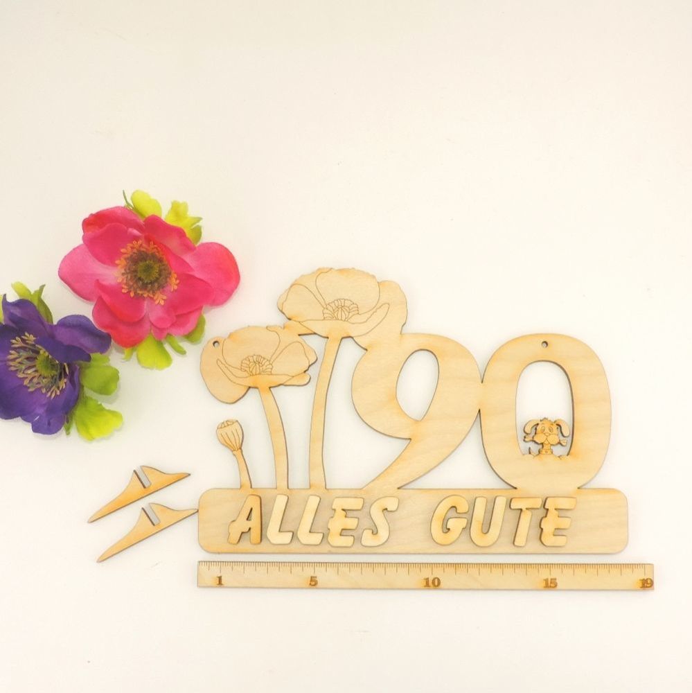 90 Zahl mit Mohnblume und Hund "Alles Gute" Geburtstag Geschenkidee aus Holz