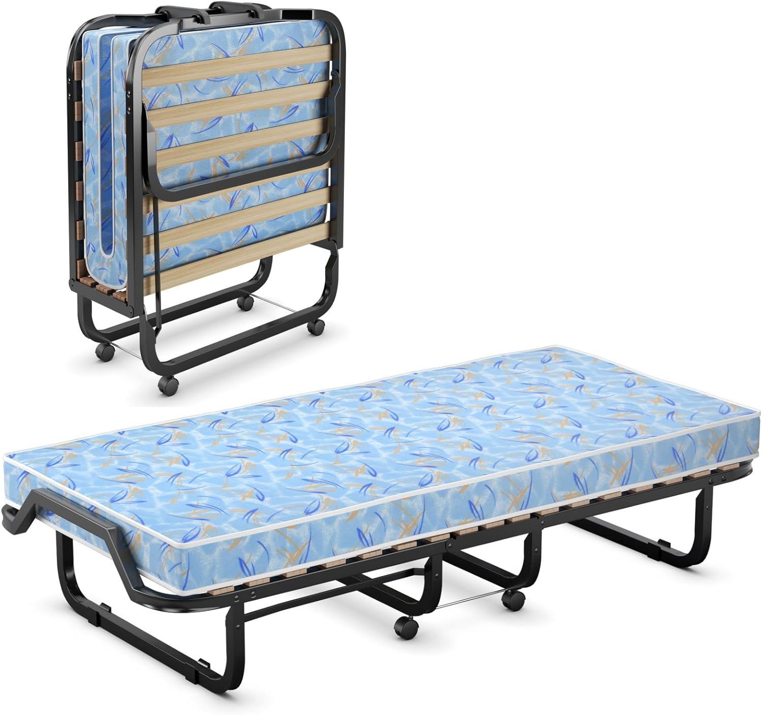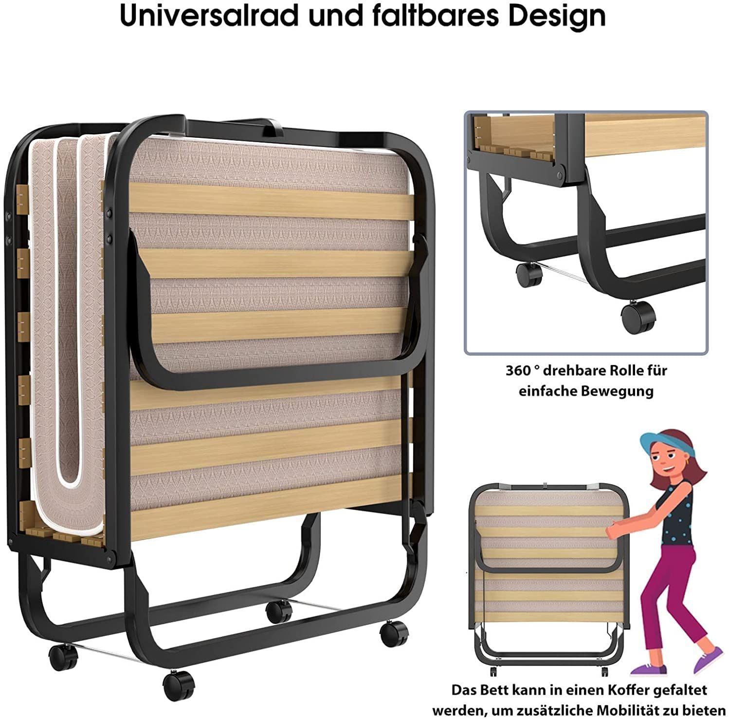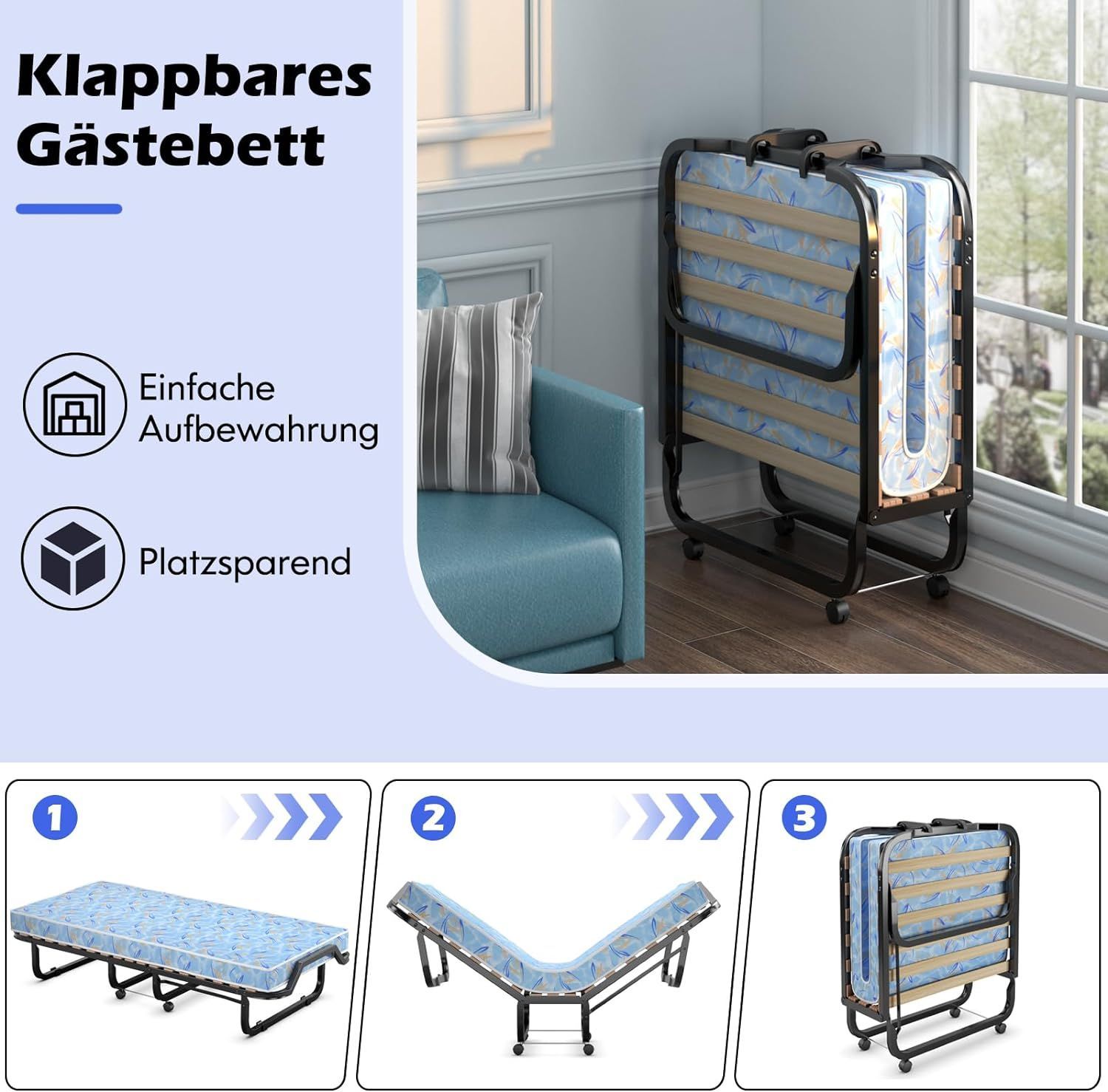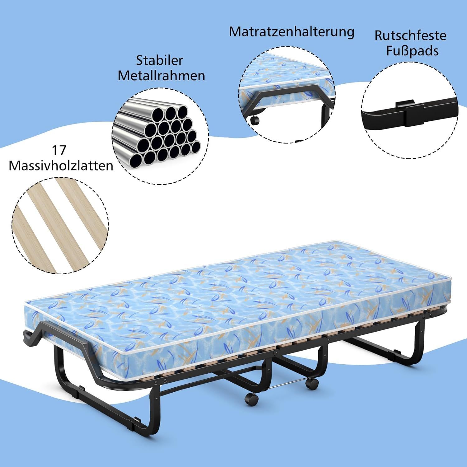 90x200cm Gästebett mit Matratze aus Rückstellschaum, Klappbares Einzelbett bis 120 kg