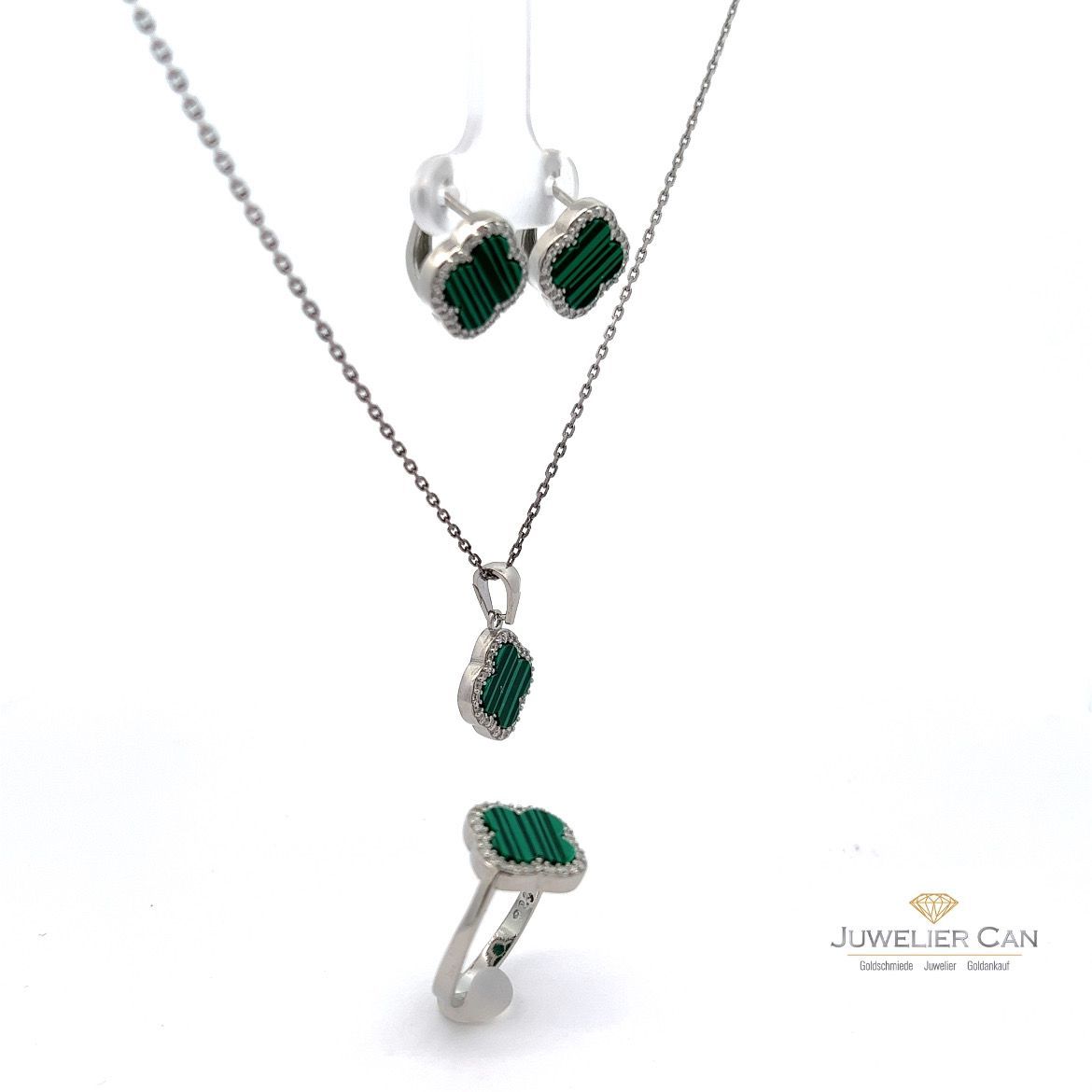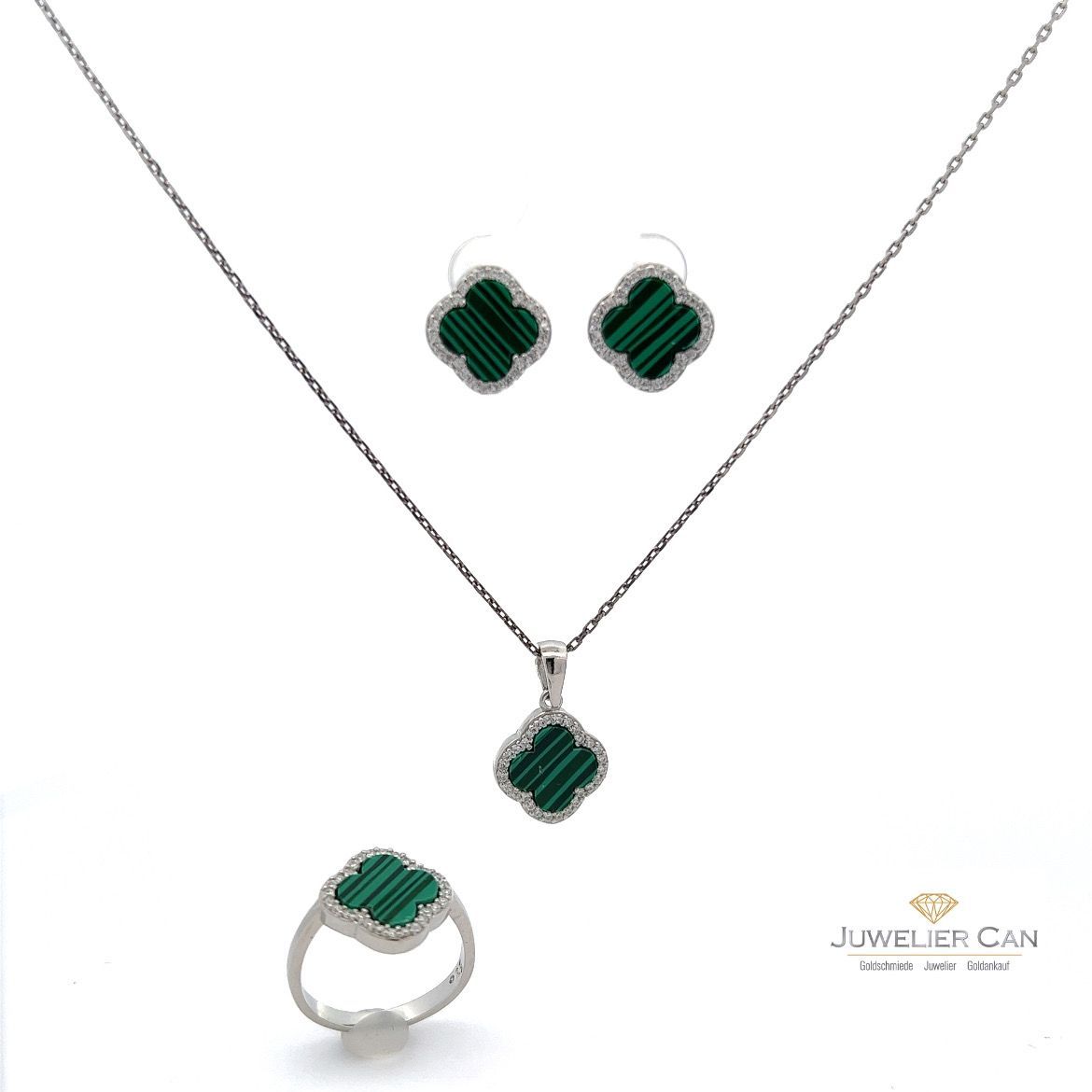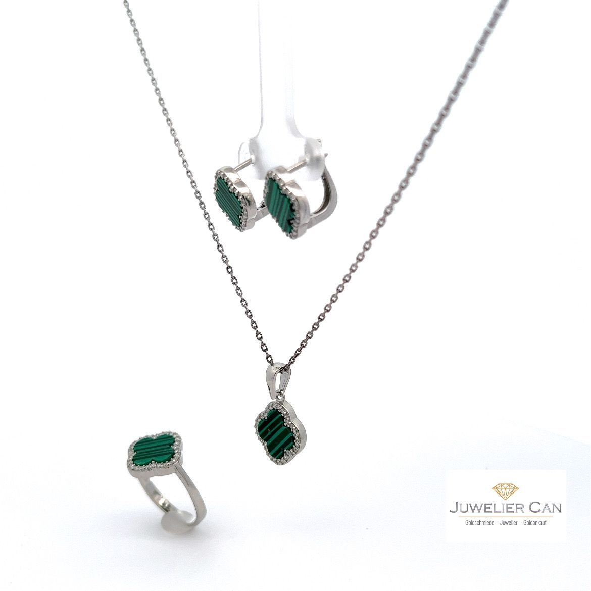 925er Silber Schmuckset - Ring, Anhänger und Ohrringe mit Malachit und Zrkonia