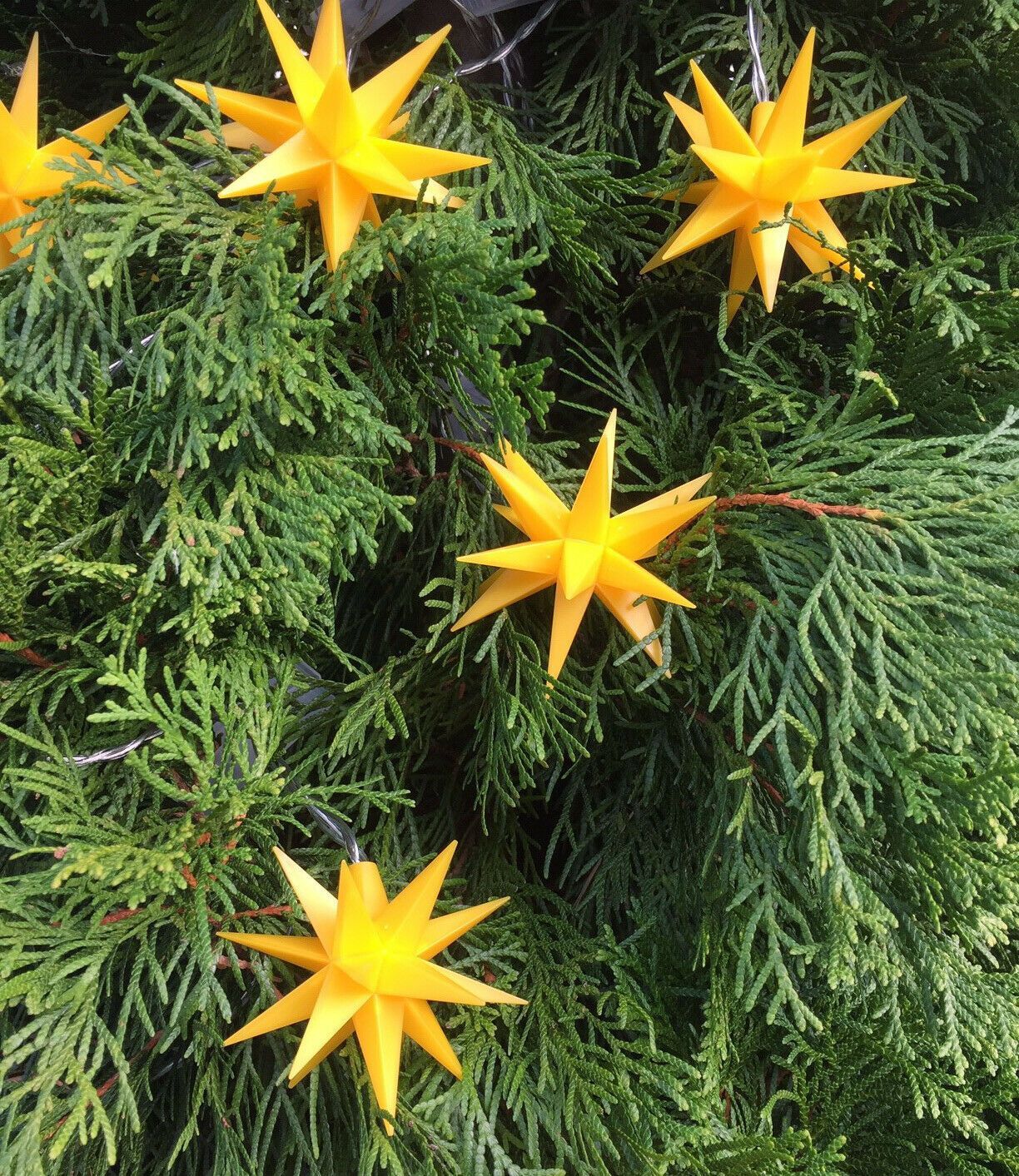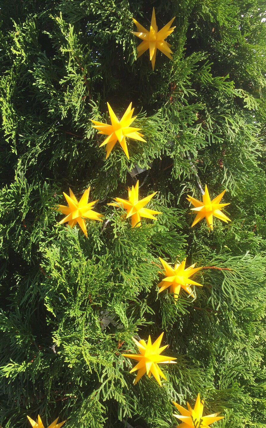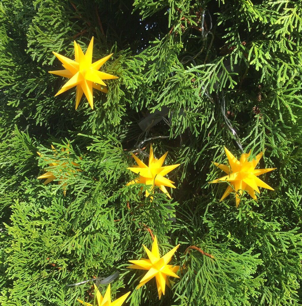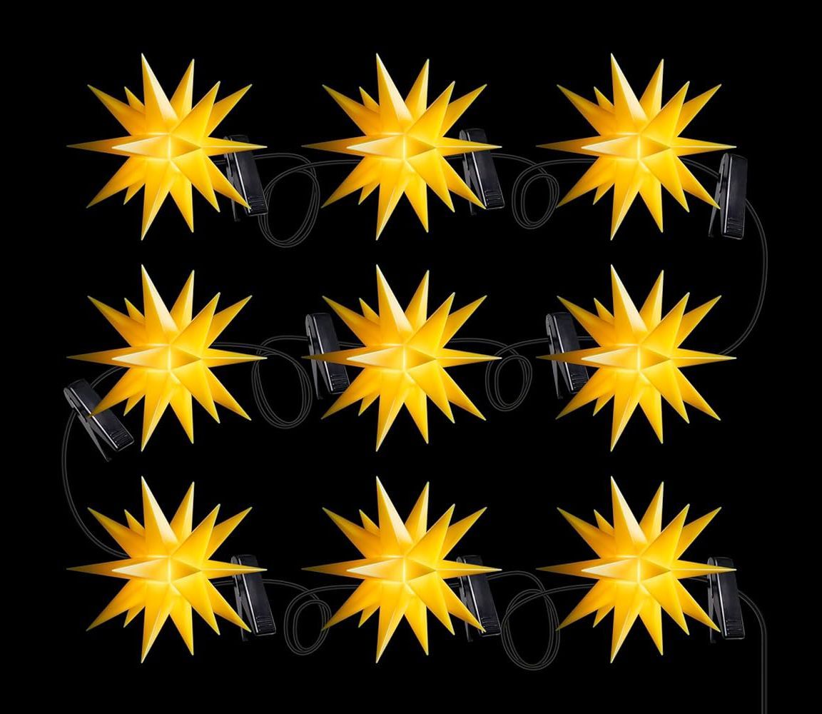 LED Sternenkette mit 9 Sternen für innen & außen GELB Winter wie Sommer eine stimmungsvolle Außen- oder Innendekoration Wunderschöne Dekoration im Garten an Ihrer Haustüre, Terrasse oder dem Balkon - immer ein toller Blickfang. Die einzelnen Kunststoff-Sterne haben einen Durchmesser von 8 cm und
