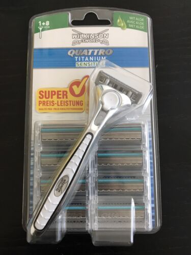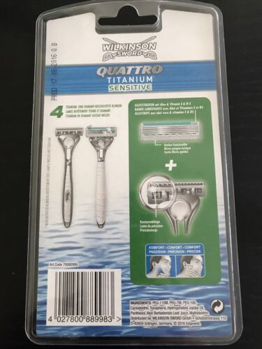 Wilkinson 9x Wilkinson Sword Quattro Titanium Sensitive Rasierklingen + Rasier NEU