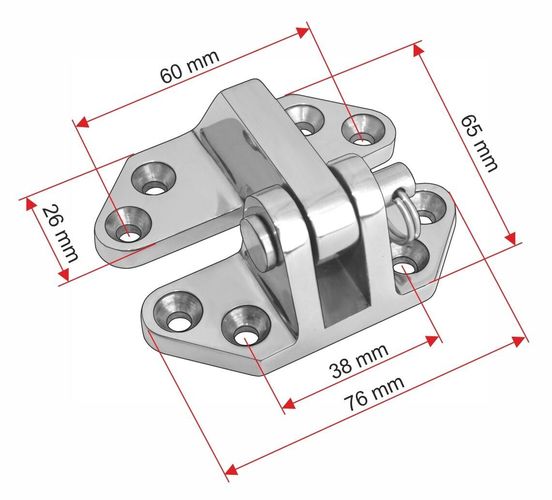Lukenscharnier 76 x 65 mm Teilbares Lukenscharnier, welches das Entfernen der Luke erlaubt. Schwere Ausführung mit herausziehbarem Bolzen. Wandstärke von außen bis Anfang Bolzenbohrung 5 mm, somit ist viel Material vorhanden, damit beim Öffnen einer schweren Luke das Scharnier nicht beschädigt wird.