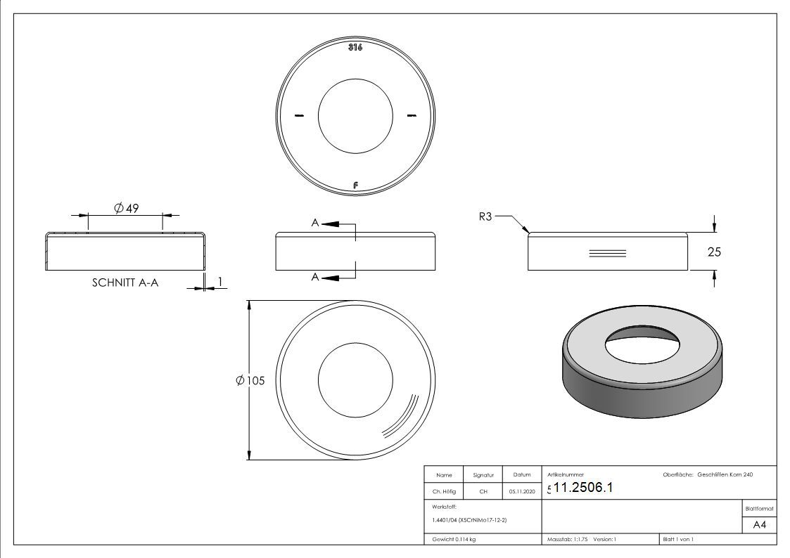 Abdeckrosette Ø 105x25 mm für Rundrohr: Ø 48,3 mm V4A