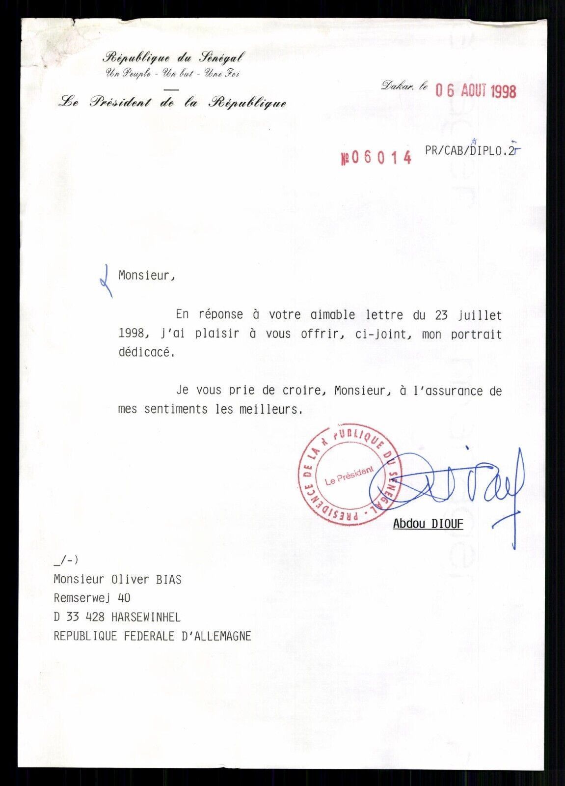 Abdou Diouf Präsident des Senegal 1981-2000 Original Signierter Brief # G 37471