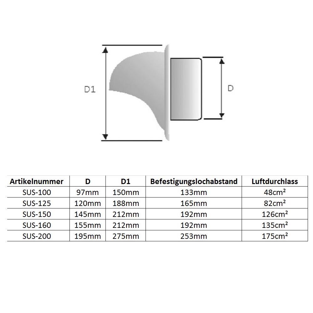 • Ablufthaube NW125 Aussenhaube Lufthaube Mauerkasten Edelstahl DunstabzugWSKED125