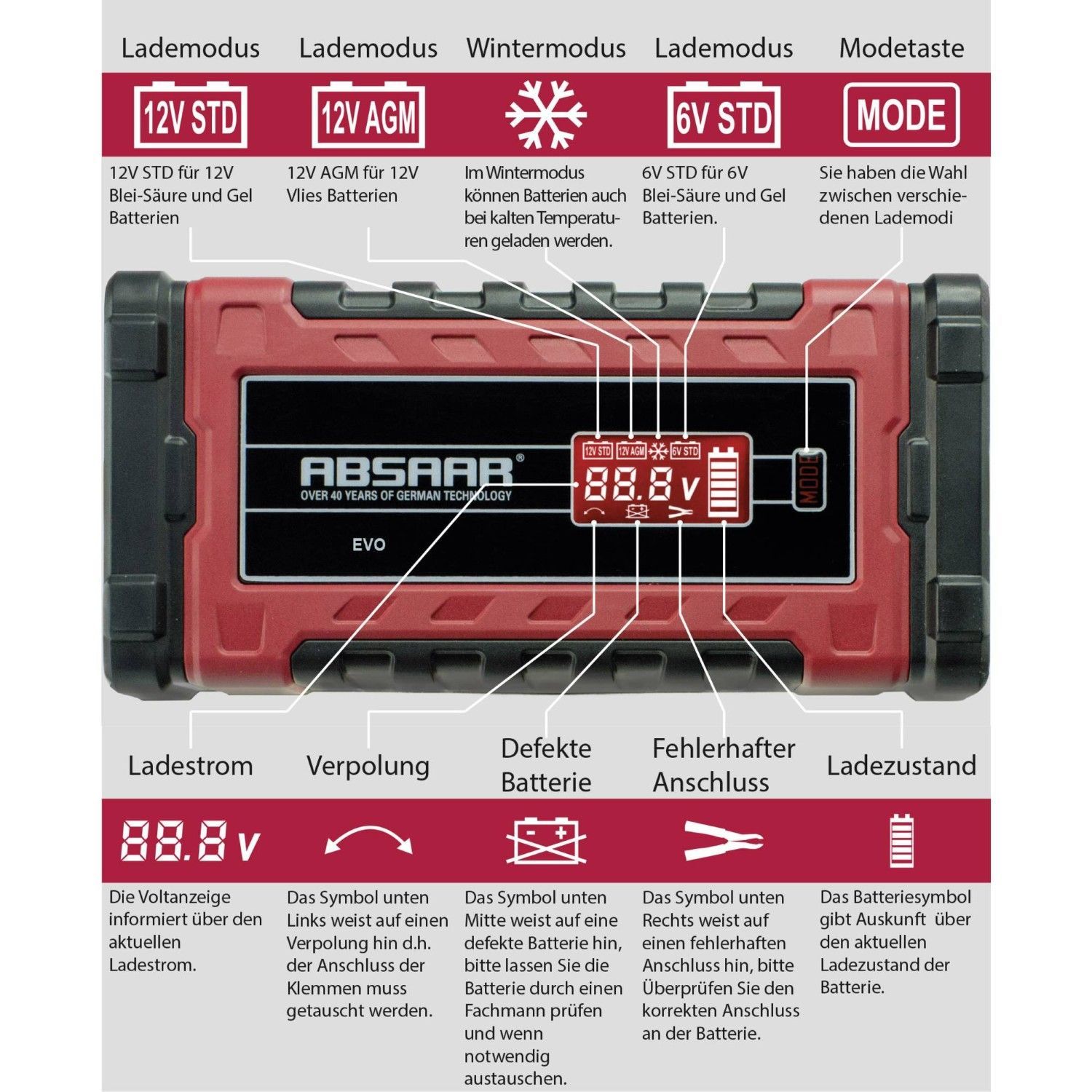 Absaar Absaar Erhaltungs-Ladegerät 6V + 12V LED Auto Motorrad Batterie-Ladegerät Lader