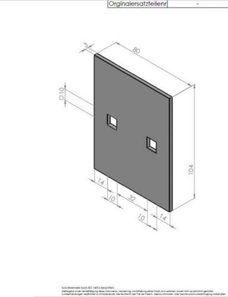 Abstreifer für Howard Technische Details: Vergleichsnr.: Werkstoff: S355MC Oberfläche: galvanisch verzinkt Abmessung: 104x80x3 Dieser Artikel ist kein Originalersatzteil. 09-01-00160