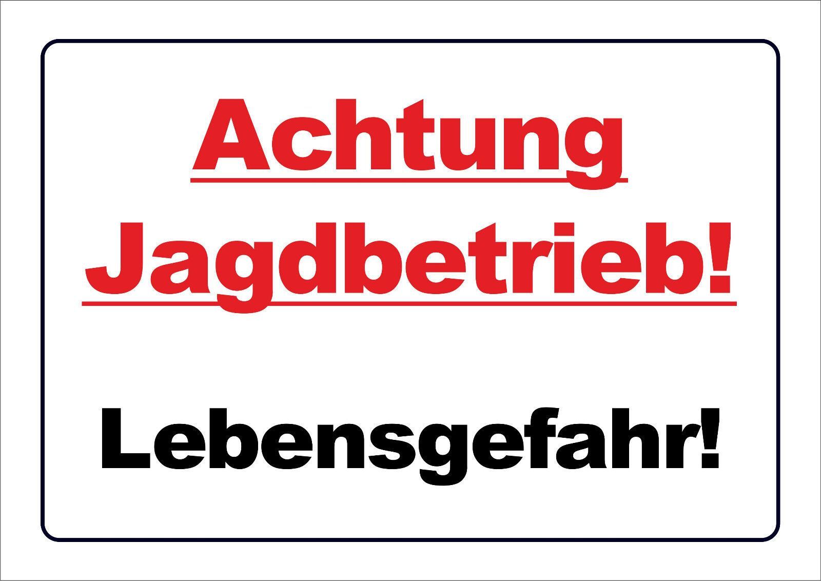 Schild: Achtung Jagdbetrieb! Lebensgefahr Größe: 15x20cm, 20x30cm, 30x40cm Technik: Wählen Sie oben aus drei verschiedenen Schildern in drei verschiedenen Größen aus: Möglichkeit 1: hochwertiger Digitaldruck auf Selbstklebefolie Druck mit UV-Farben, lichtecht, jahrelang verwendbar. Die Klebeschilder