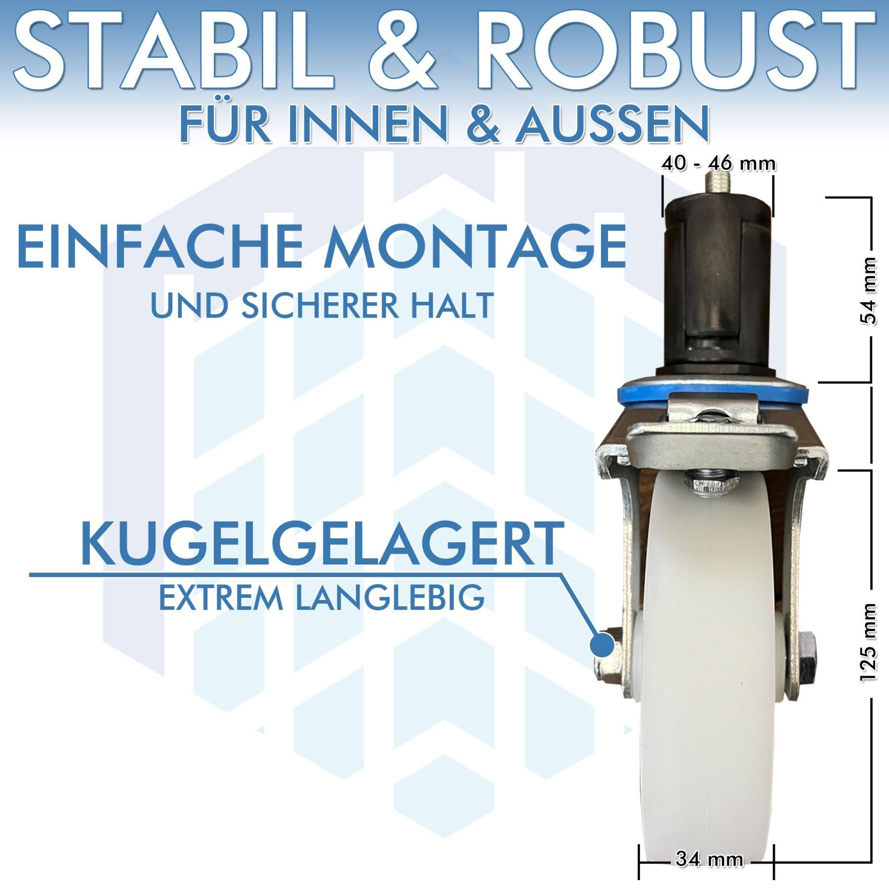 4 Stück AC Gerüstrollen 125 mm, max. Belastung: 150 kg Stück, doppelt gebremst (horizontal & vertikal), Rolle: Nylon DIN-EN 1004-1 Außendurchmesser des Steckzapfens: 40-46 mm Die Farbe der Rollen kann abweichen. verwendbar für: Gerüste aller Hersteller mit einem Rohrinnenmaß von 40-46 mm.