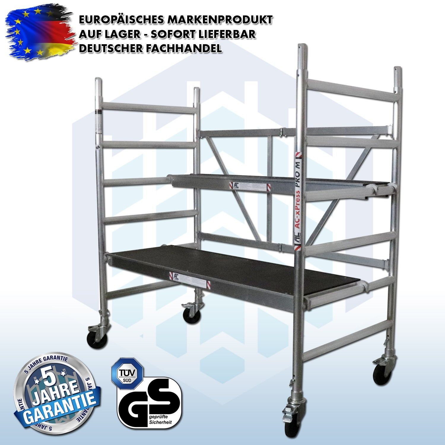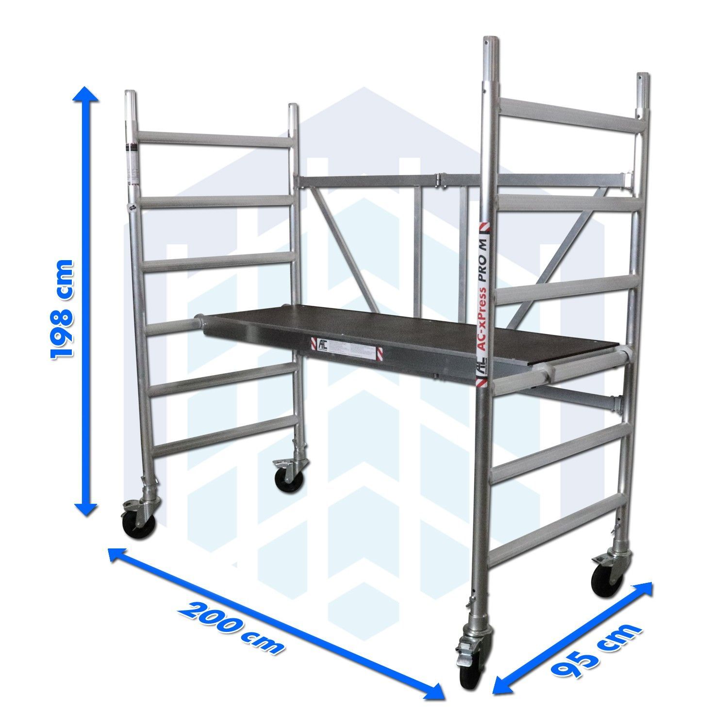 3 m Arbeitshöhe - AC Steigtechnik xPress PRO-M” Zimmerfahrgerüst mit EXTRA großer Arbeitsfläche: 90 x 190 cm AC Steigtechnik Zimmerfahrgerüst xPress PRO-M mit extra breitem Rahmen, XL-Plattform (190 x 90 cm) für den professionellen Einsatz, kompakte Bauform mit 6-Sprossen Rahmen, TÜV GS, DIN E