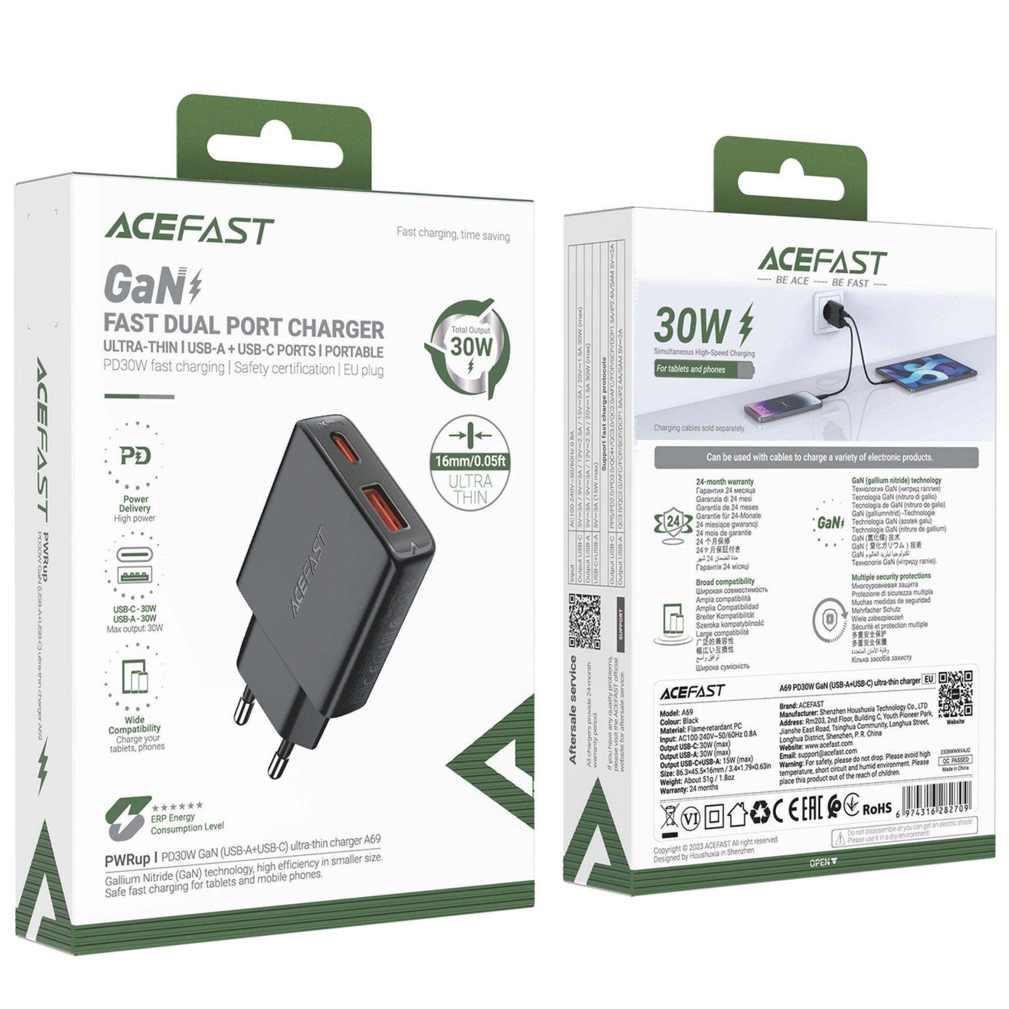 Acefast A69 Ladeadapter PD 30W GaN USB-A USB-C Wandladegerät – Schwarz