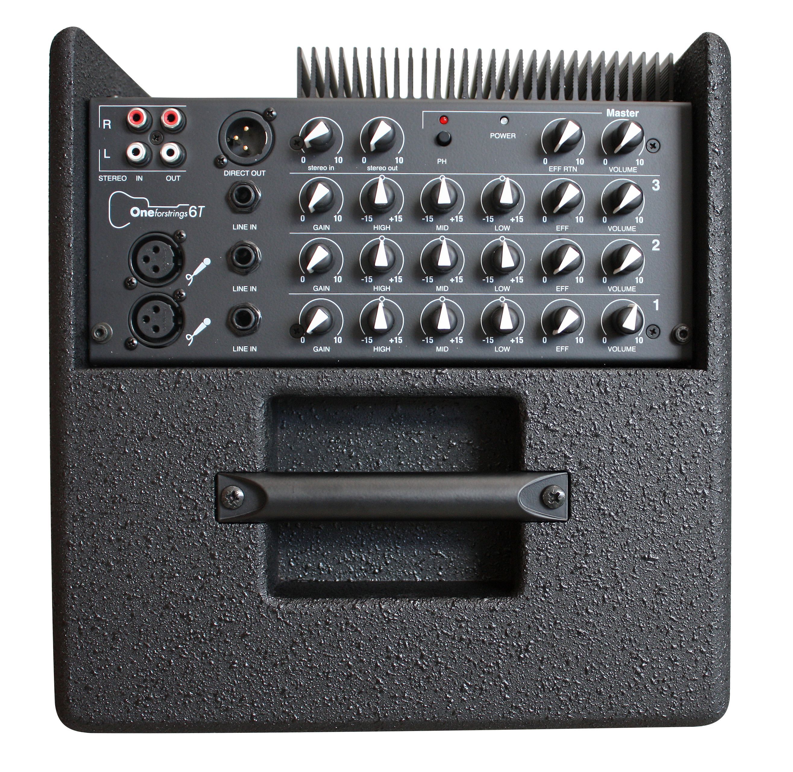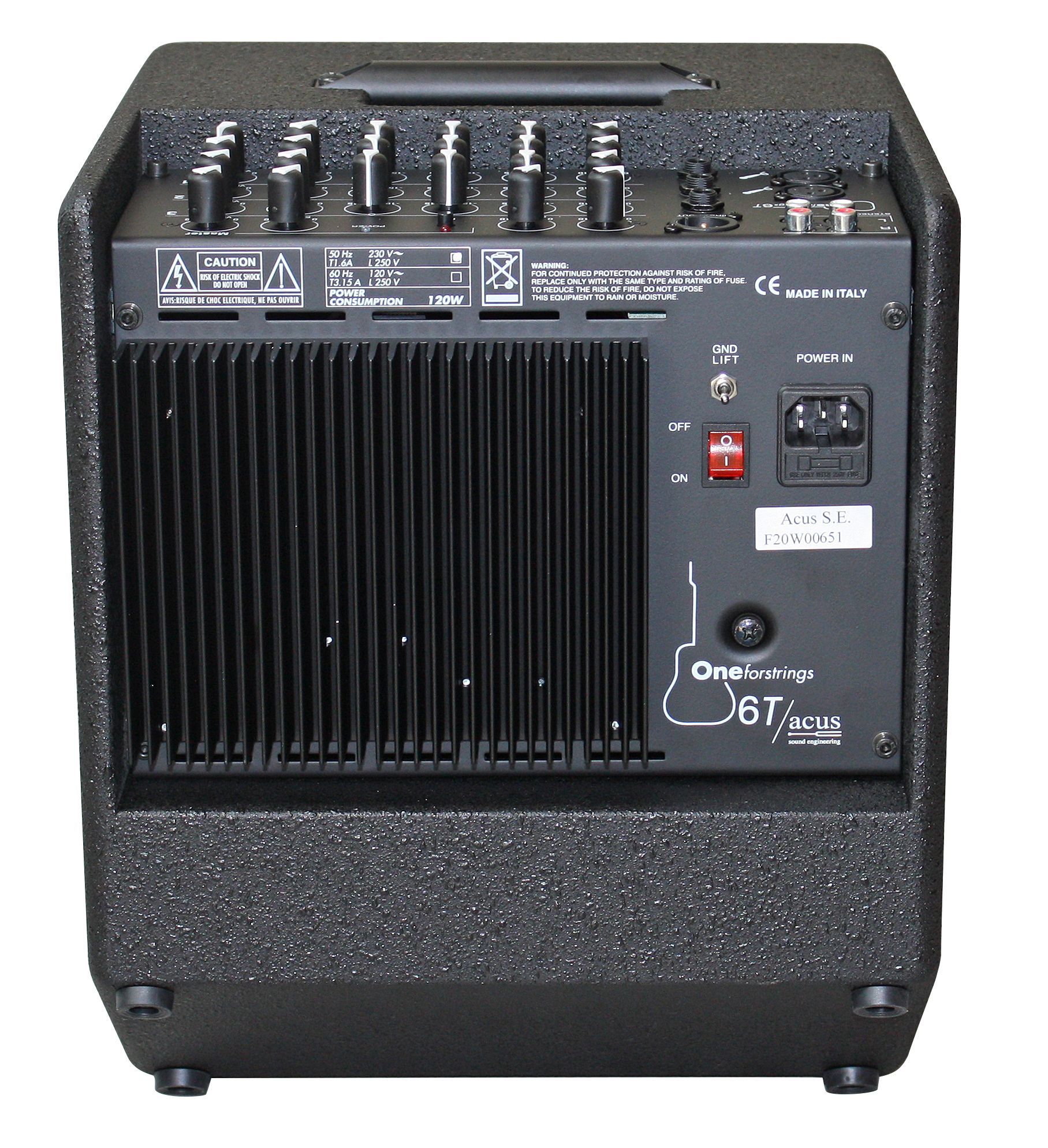Acus ONE - 6T Simon - Black Acoustic Combo Akustik Combo 130 Watt Lautsprecher: 6'' Bass + Ring HT Kanäle: 3 Eingänge: 2 x XLR ( Mikro ) - Line IN ( Klinke ), 1 x Line-IN ( Klinke ), 1 x Stereo-IN ( Cinch L-R ) Ausgänge: 1 x Direct OUT ( XLR ), Stereo-OUT ( Cinch L-R ) Regler ( Channel 1 + 2 ): Gain