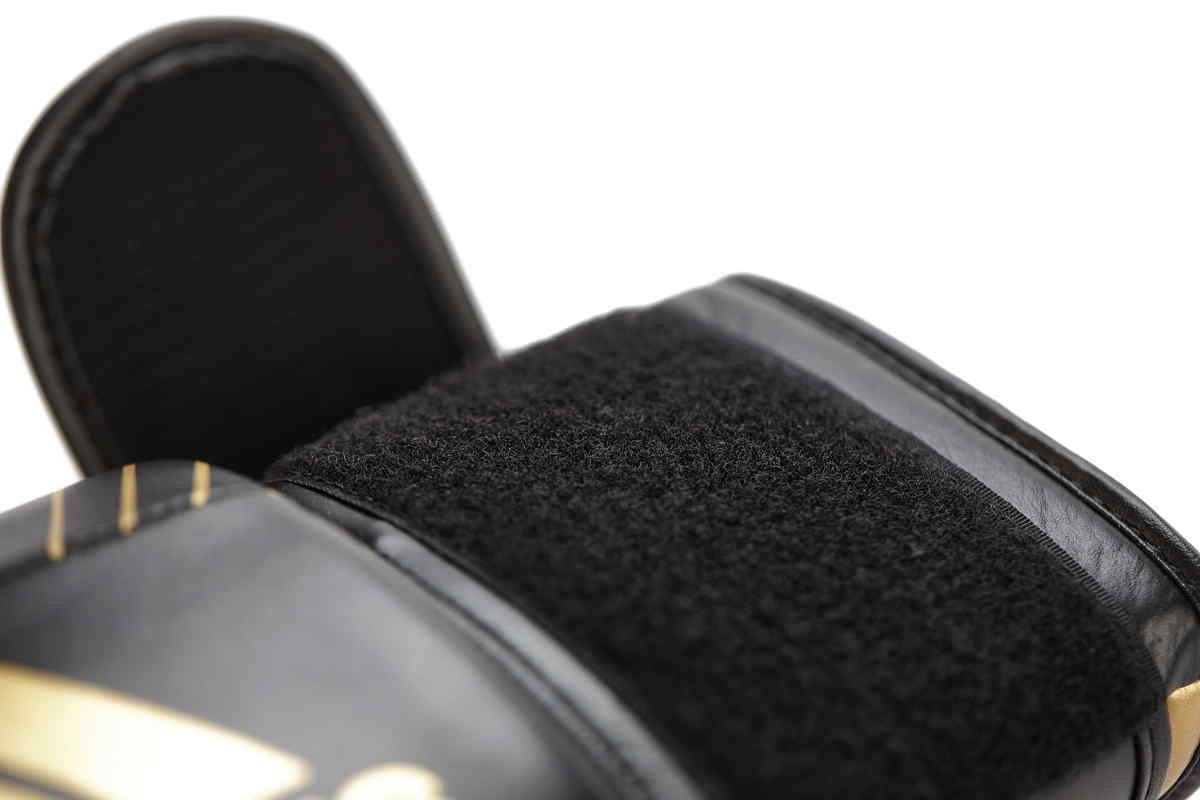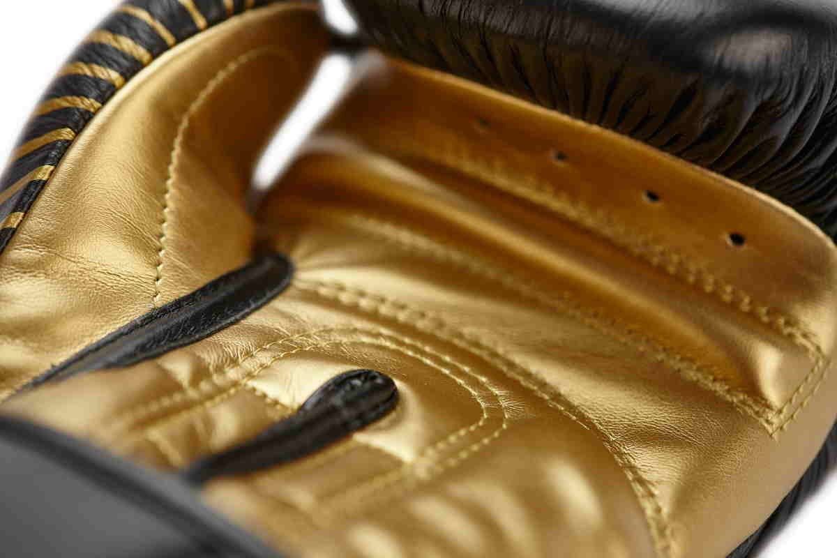 Eigenschaften: Außenmaterial: Rindsleder Innenmaterial: FLX 3.0 synthetic PU-Material Farbe schwarz/gold Klettverschluss WAKO Zulassung Größen: 10, 12, 14, 16 oz